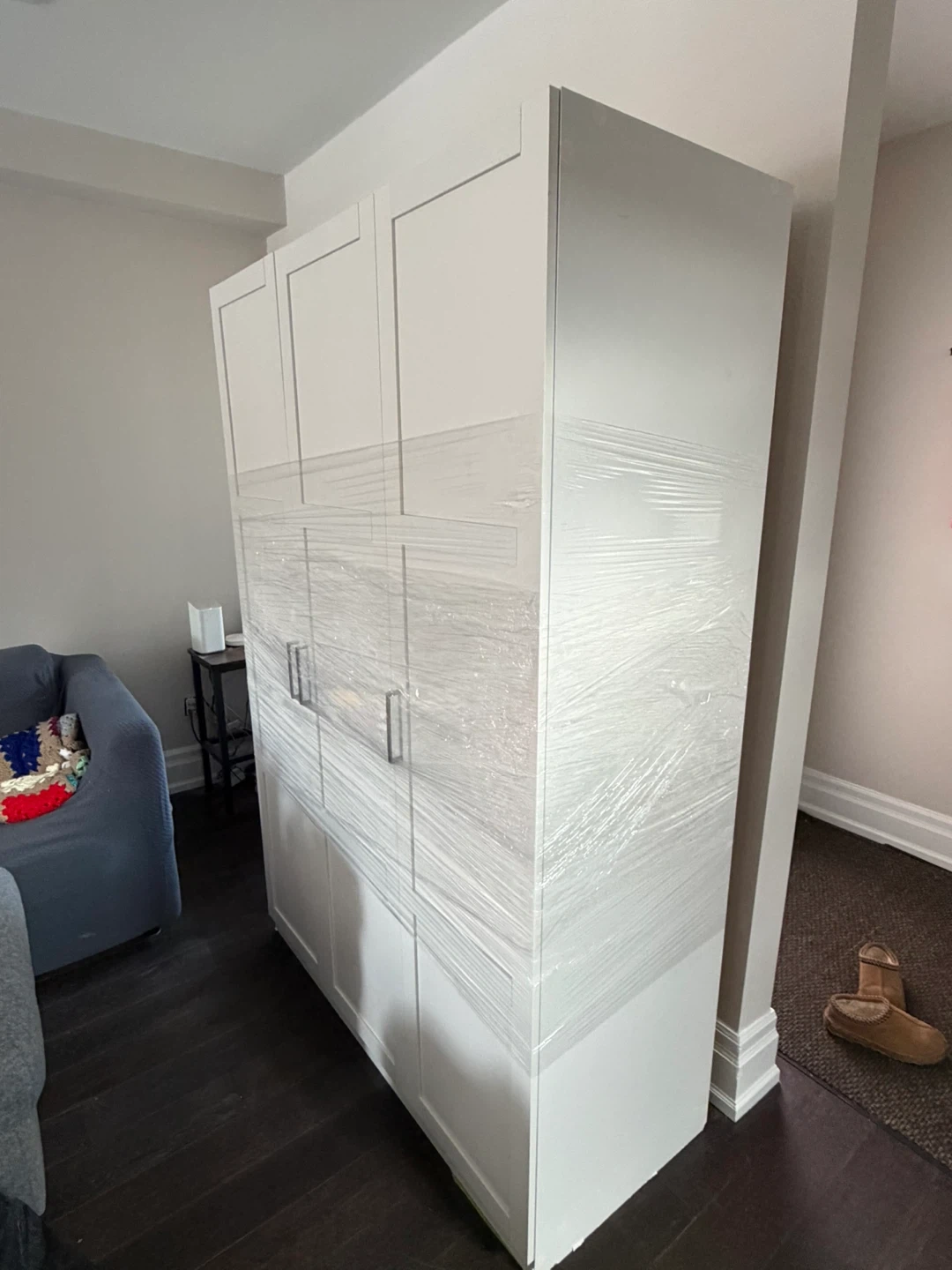 White Sauder 3-door wardrobe/armoire for clothes storage. It has a hanger rod and shelves. This cabinet is in good condition and wrapped for moving.