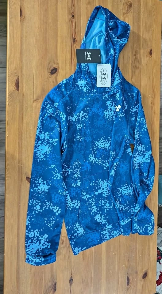 Brand new with tags, boys size large blue camouflage hoodie from Under Armour. Features a front pouch pocket and adjustable drawstring hood. Fabric is soft and lightweight. All washed in cold water and dried on delicate. No stains or rips. Wore by only one child. Prices are firm. Smoke free home. Public pick up only in the Walkers and Upper Middle area of Burlington.