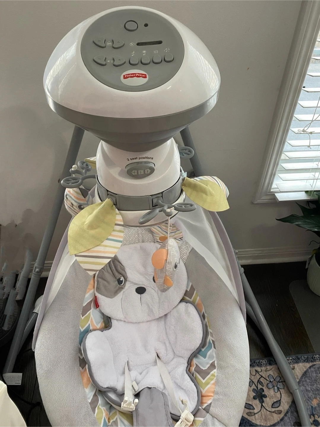 This Fisher-Price baby swing is designed for comfort and entertainment. It offers 3 seat positions for your baby's needs. Includes a soft plush dog toy for added fun.