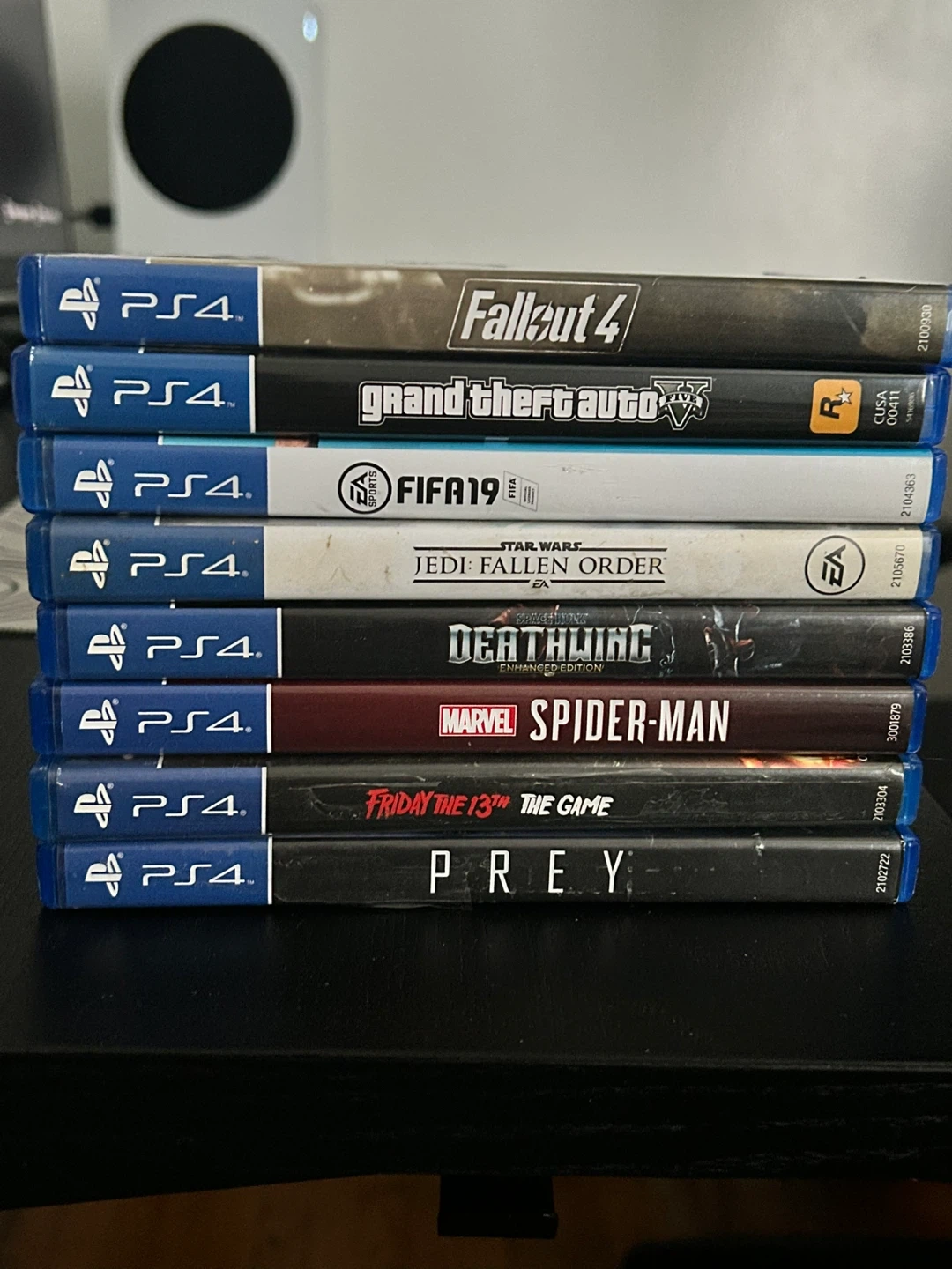 Fallout 4, Grand Theft Auto V, FIFA 19, Star Wars Jedi: Fallen Order, Deathwing Enhanced Edition, Marvel's Spider-Man, Friday the 13th: The Game, and Prey. All are for PlayStation 4. These games are perfect for any PS4 gamer looking to expand their library!