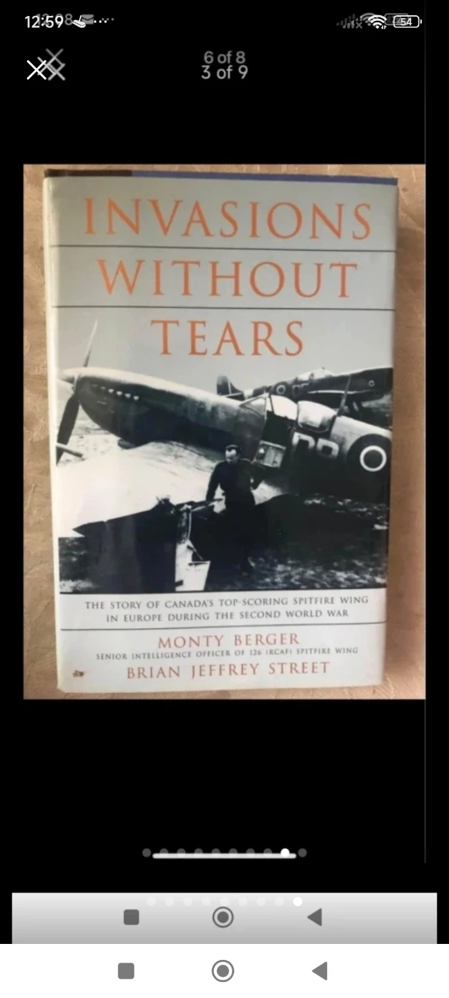 This is the book 'Invasions Without Tears'. It details the story of Canada's top-scoring Spitfire wing in Europe during World War II. The book features Monty Berger, Senior Intelligence Officer of 126 (RCAF) Spitfire Wing, and is written by Brian Jeffrey Street. This historical account is for anyone interested in Canadian military history or WWII aviation.