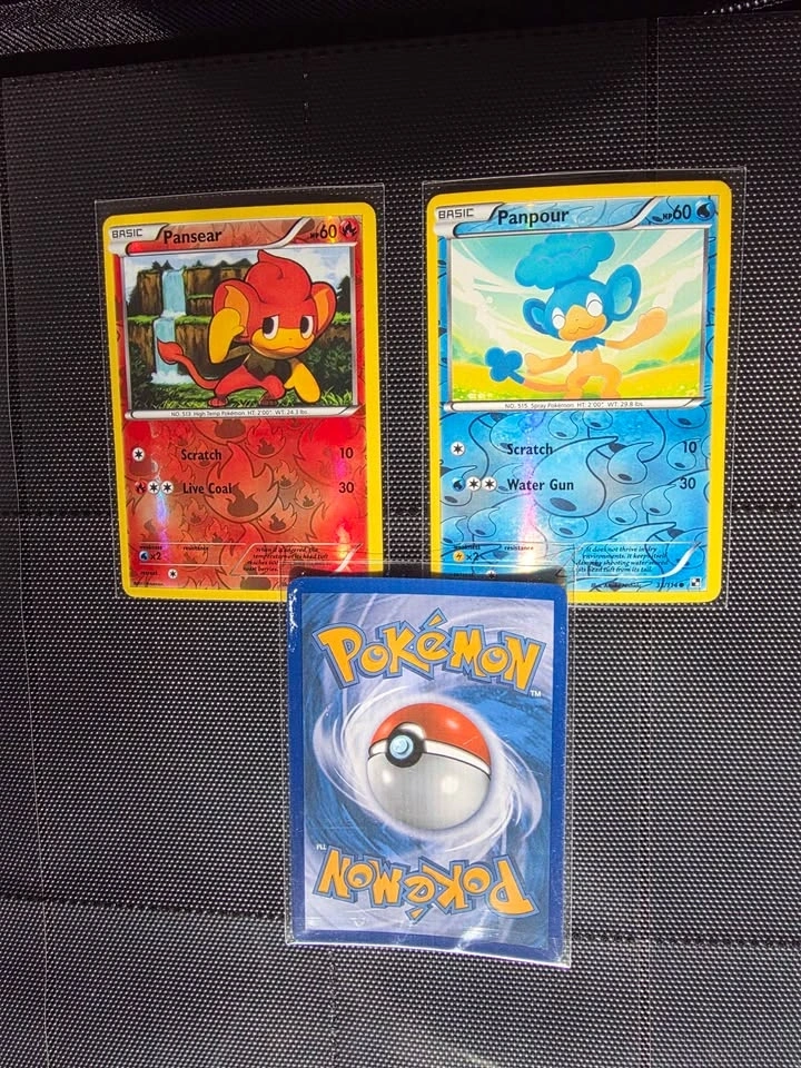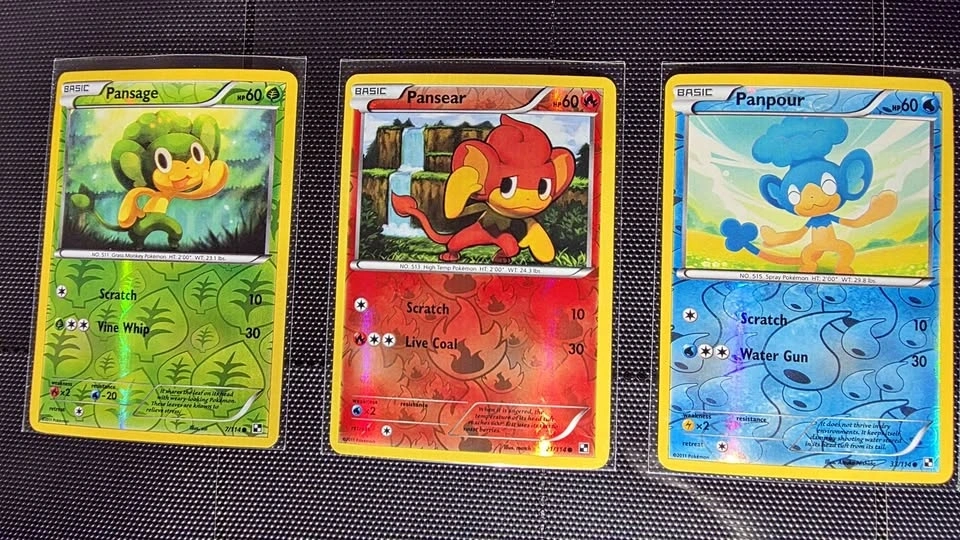 Pansage 7/114, Pansear 21/114, Panpour 33/114 - Energy Holos - Promos. Pansage has moderate wear as shown on reverse in picture. Front looks great. Pansear & Panpour - NM.
