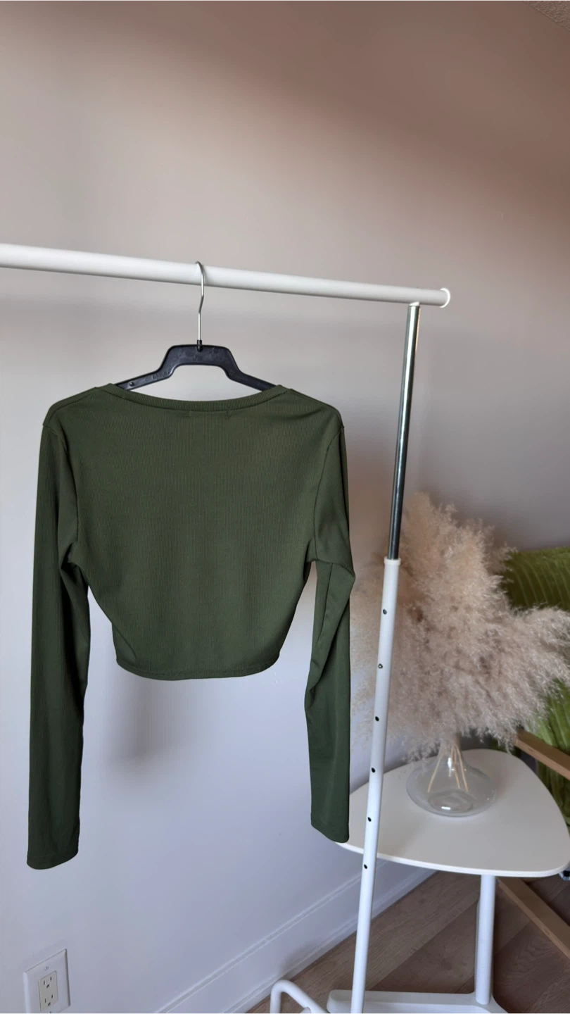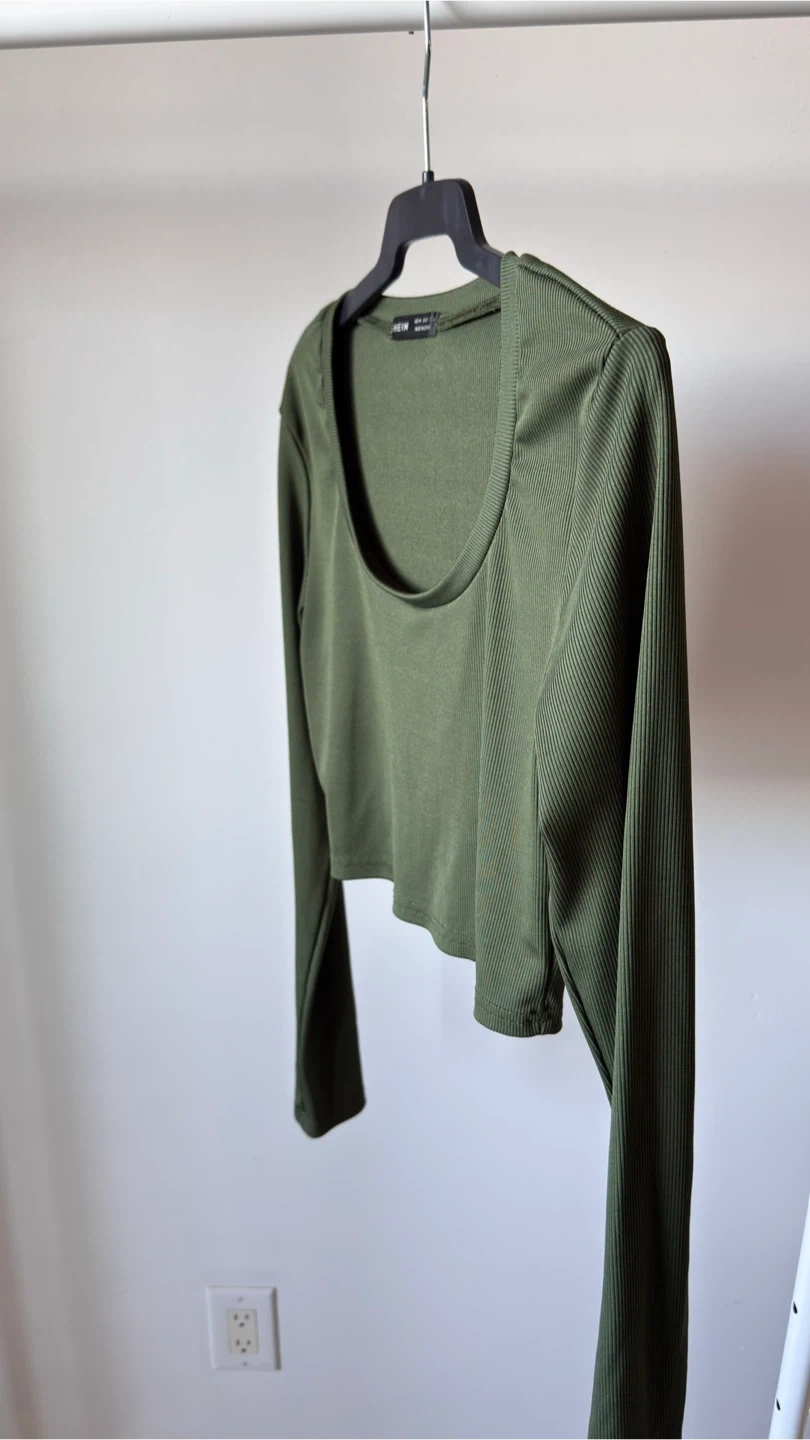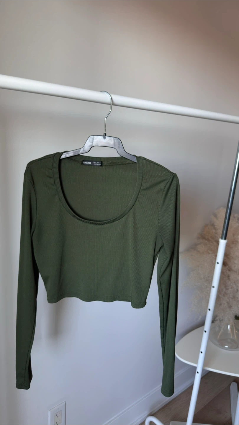 This is a SHEIN olive green ribbed long-sleeve cropped top. It features a scoop neckline. Made from a stretchy knit fabric for a comfy fit.