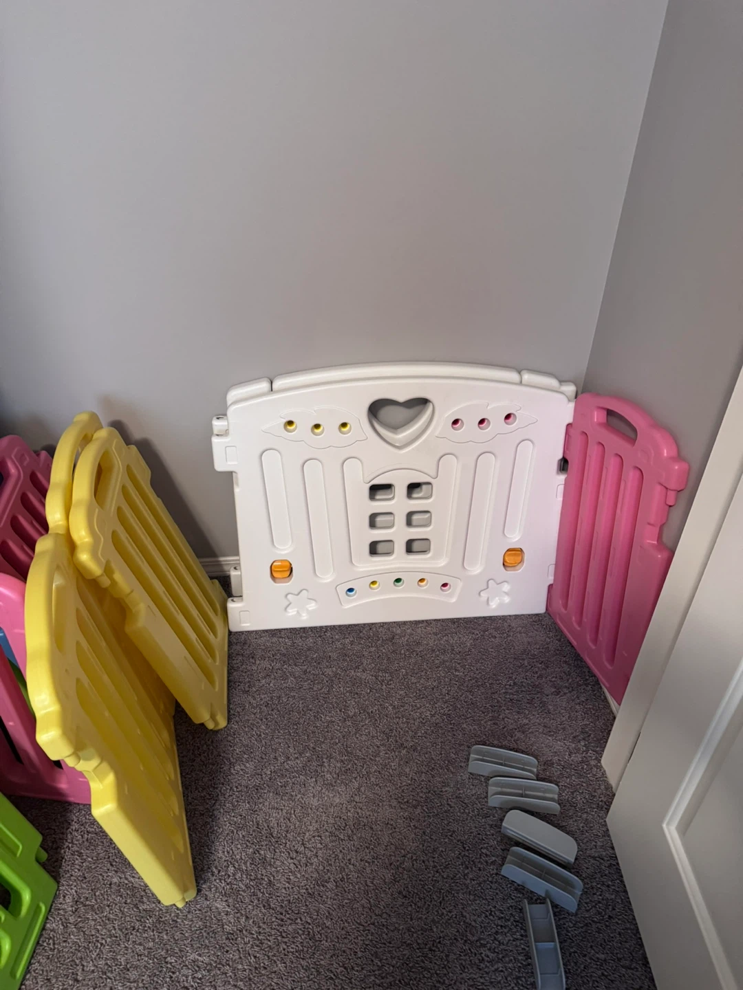 This is a set of colourful plastic playpen panels. They are designed for child safety. Includes connectors and some panels have interactive features.