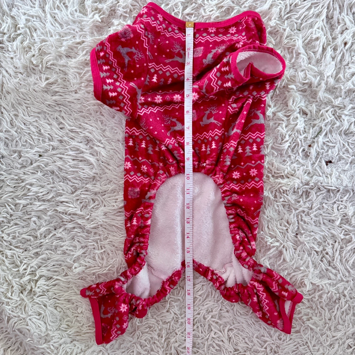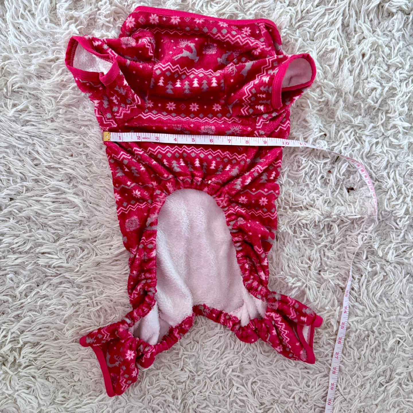 Keep your furry friend cozy this holiday season with these adorable red pet pajamas! They feature a festive pattern with reindeer and Christmas trees. Size L. Perfect for those chilly nights!
