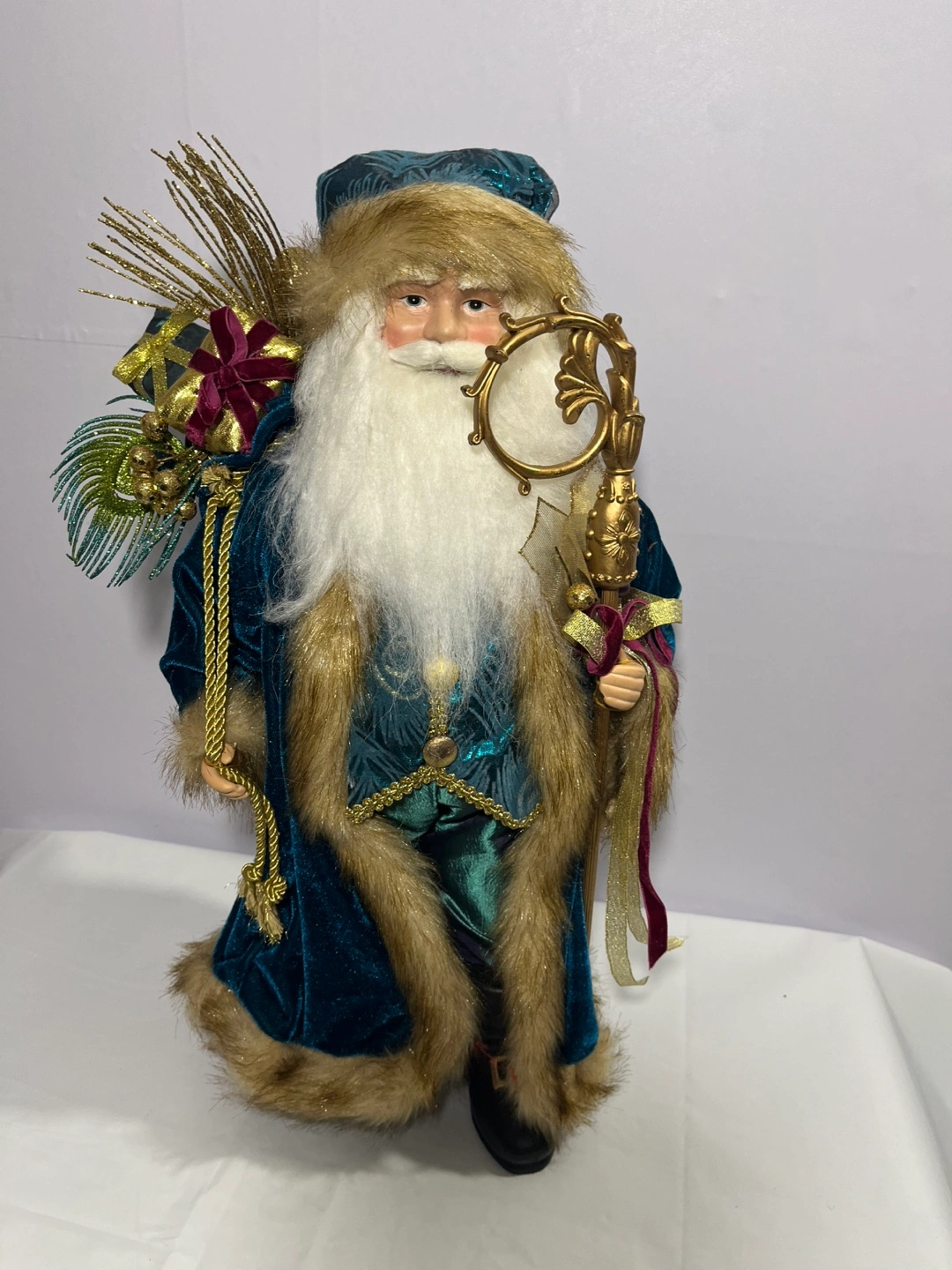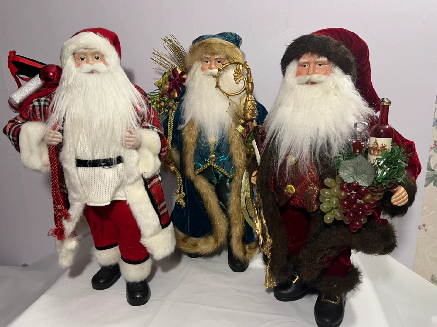 Selling a collection of 18” Tall Santa Claus figurines. They are each dressed in unique outfits and holding different accessories. Perfect for holiday decorations!