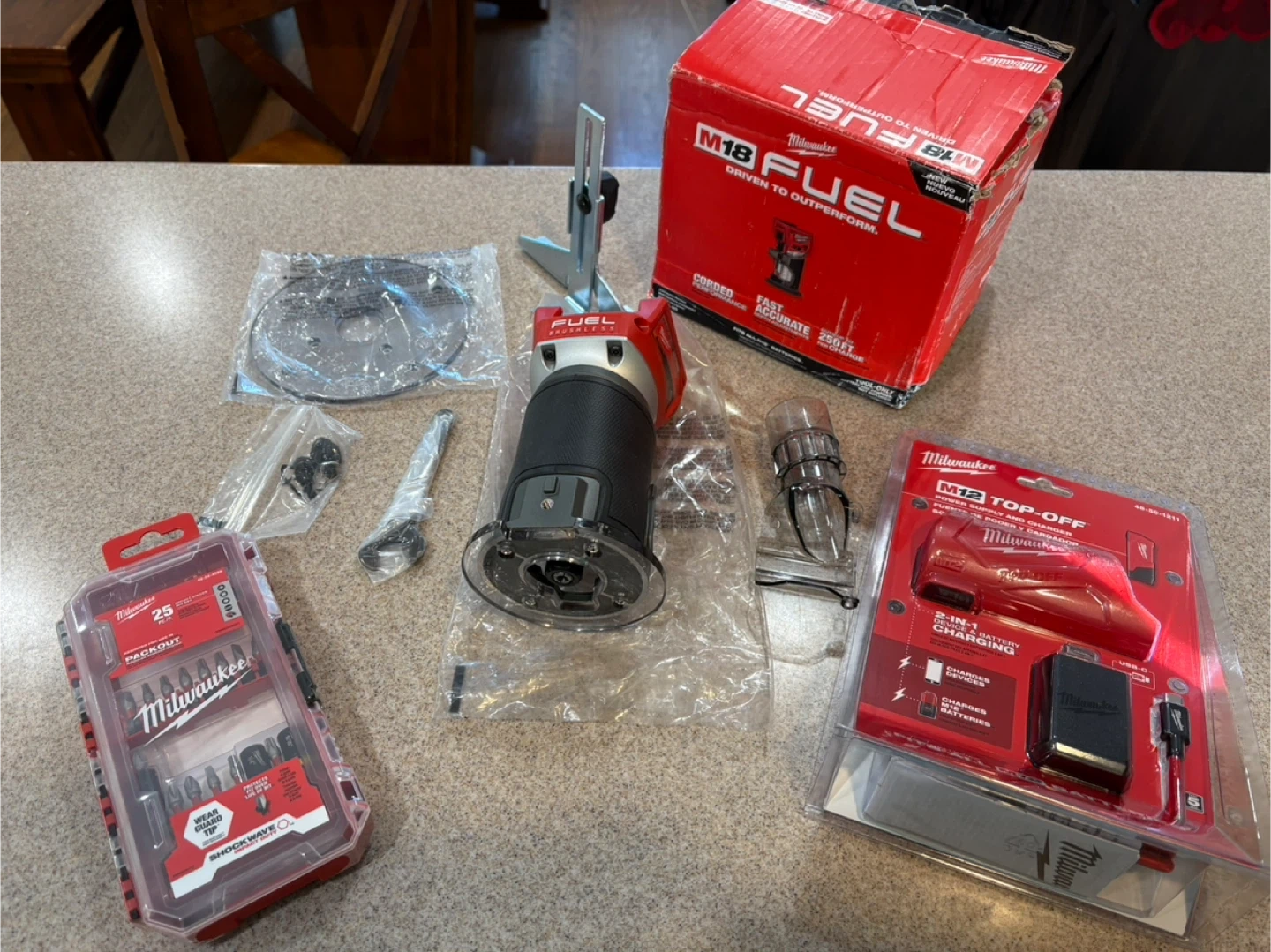 Brand new in the box, Milwaukee, compact router. Also included with purchase Milwaukee M12, top off power supply and shockwave 25 piece impact bit set packout ready. batteries not included.