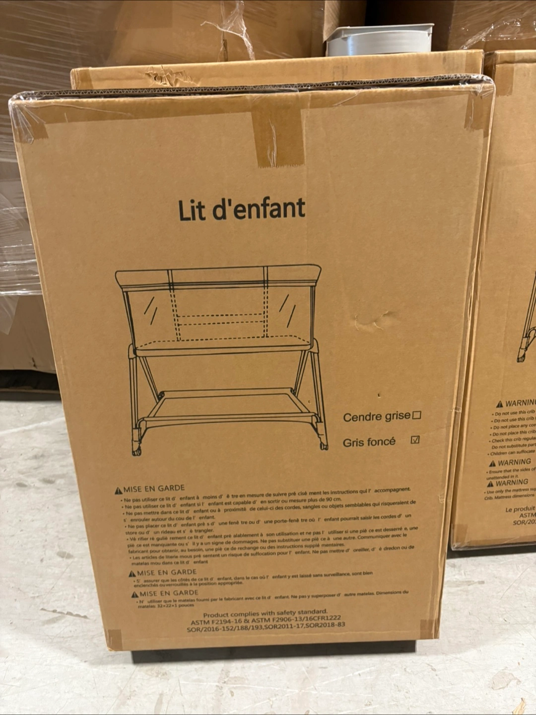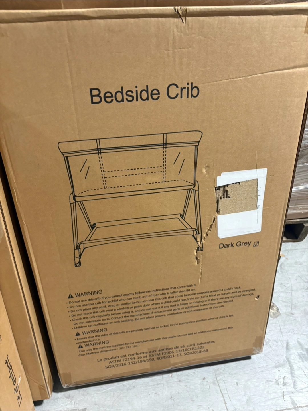 Selling a bedside crib in dark grey. It's still in its original box! Perfect for keeping your little one close by during the night. Please note it is a lit d'enfant.