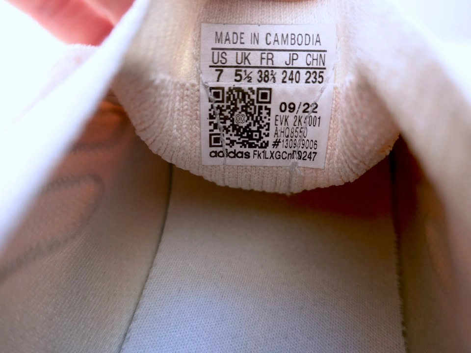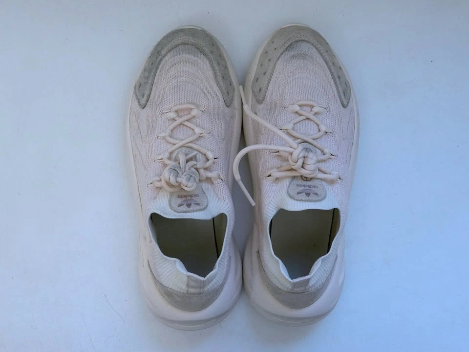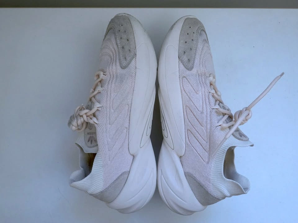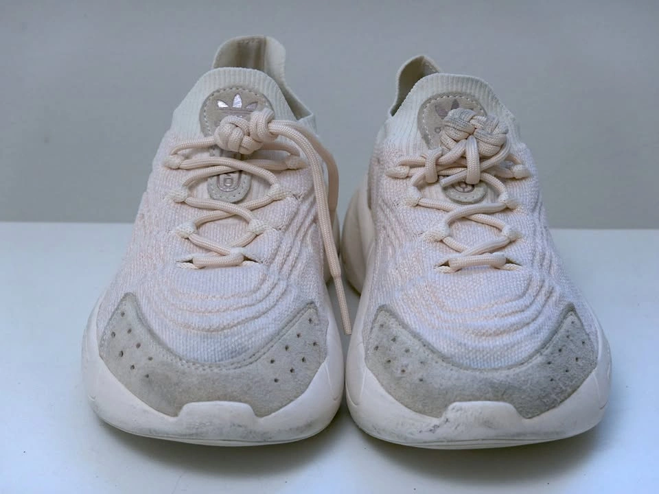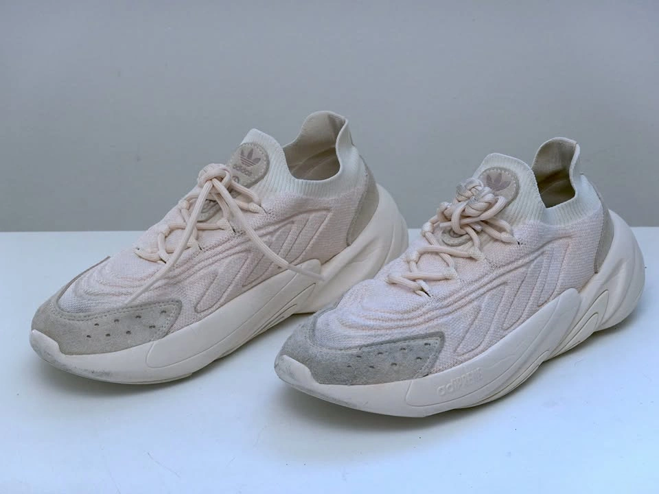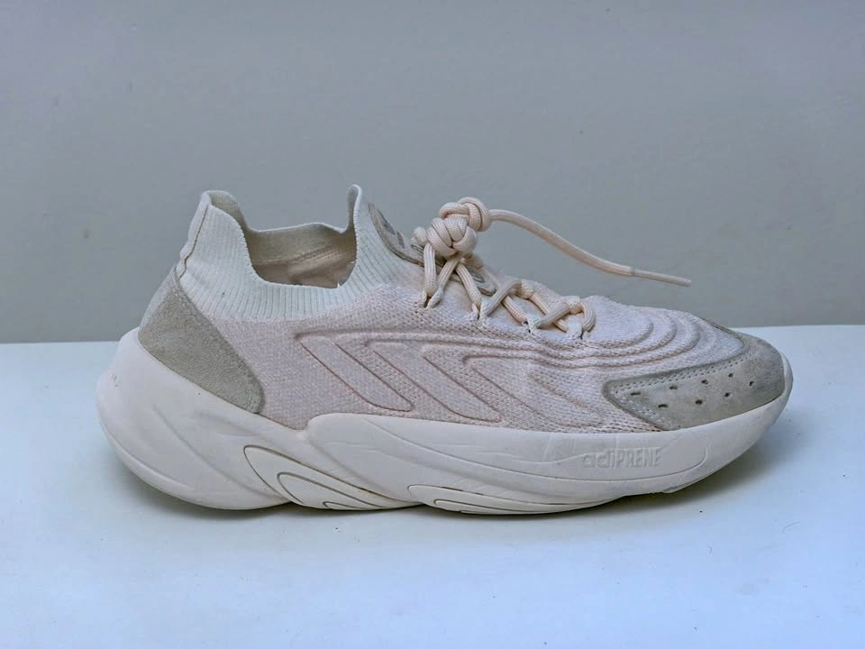 US Women’s size 7. Adidas Ozelia Knit shoes, model HQ8550. Primeknit uppers made of 50% recycled content, adiPrene cushioned sole. Pale pink/white/beige.