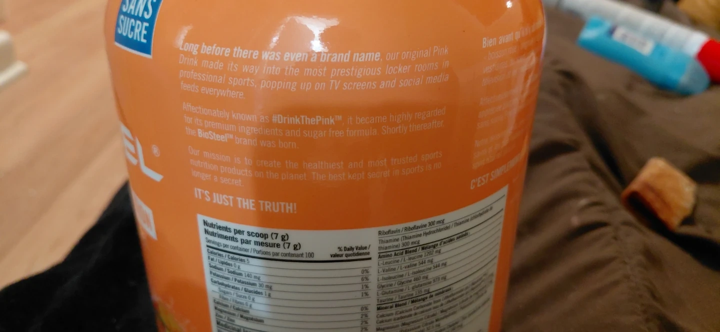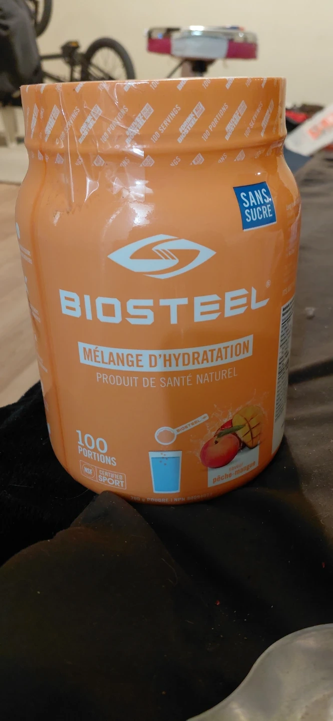 This is Biosteel Hydration Mix in a Peach Mango flavour. It's a natural health product with 100 servings per container. Contains 7 grams per scoop. Sugar-free formulation.