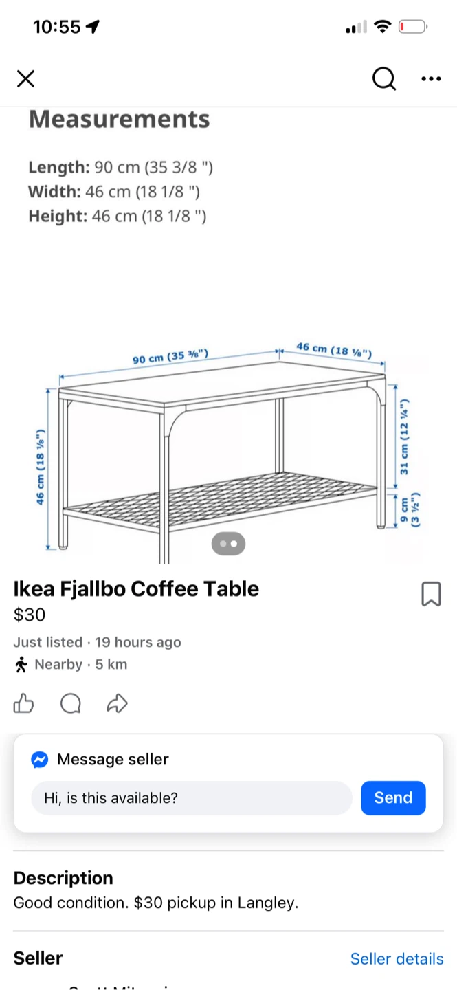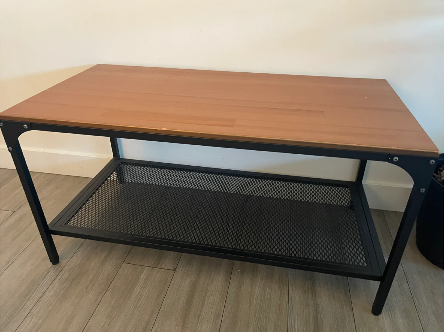 This Ikea Fjallbo coffee table has a wood top and a metal frame with a lower shelf. Length is 90 cm, width is 46 cm, and height is 46 cm. It's great for a living room or den!