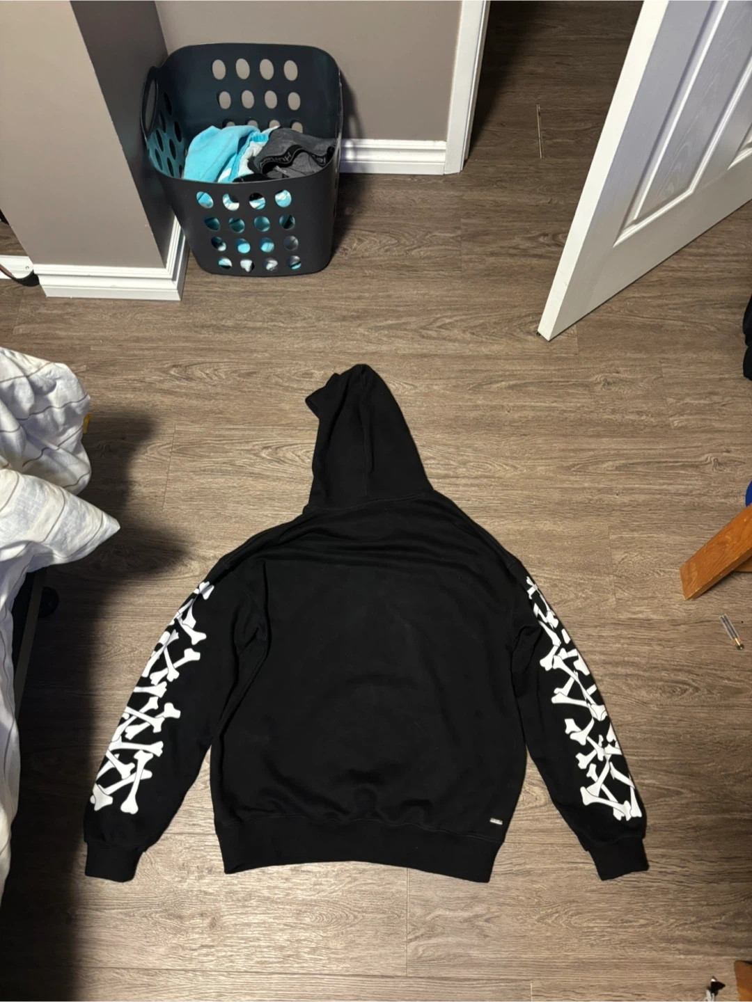 Selling a black Amiri hoodie with the signature bones design on the sleeves. It's in great condition and ready for a new home! The material is soft and comfortable, perfect for everyday wear. This hoodie is a stylish addition to any wardrobe