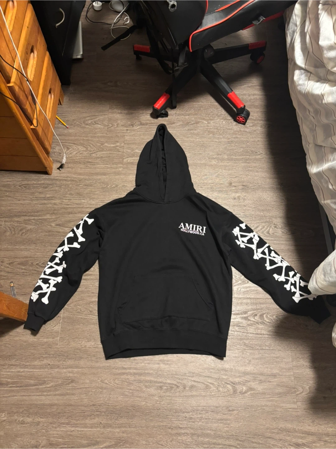 Selling a black Amiri hoodie with the signature bones design on the sleeves. It's in great condition and ready for a new home! The material is soft and comfortable, perfect for everyday wear. This hoodie is a stylish addition to any wardrobe