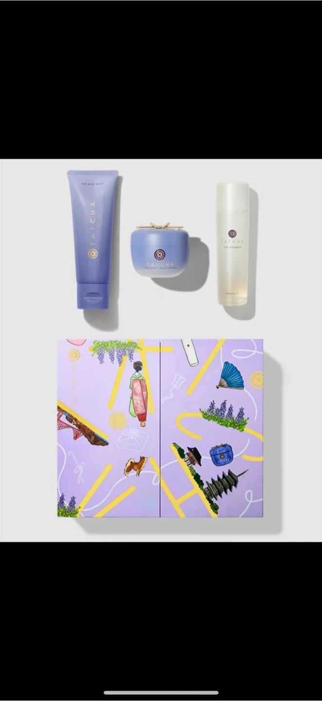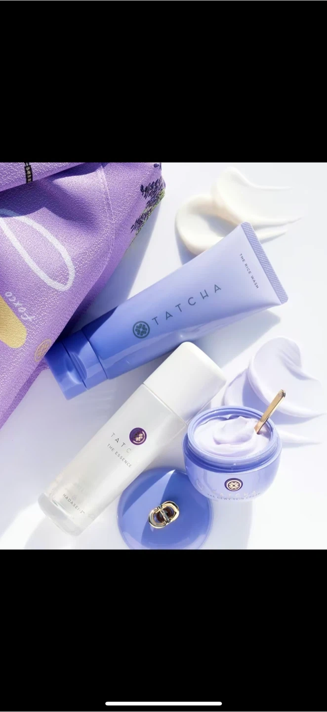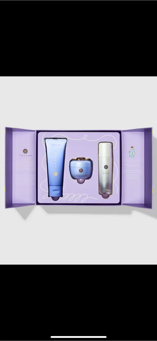 Selling a Tatcha skincare set that includes The Rice Wash, The Dewy Skin Cream, and The Essence. These products are designed to leave your skin feeling refreshed and hydrated. The set comes in its original packaging, making it perfect as a gift or for treating yourself!