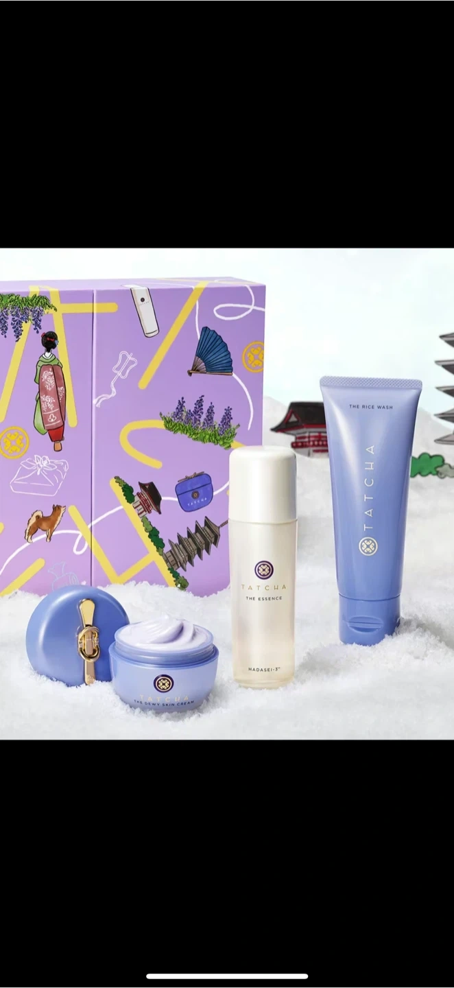 Selling a Tatcha skincare set that includes The Rice Wash, The Dewy Skin Cream, and The Essence. These products are designed to leave your skin feeling refreshed and hydrated. The set comes in its original packaging, making it perfect as a gift or for treating yourself!