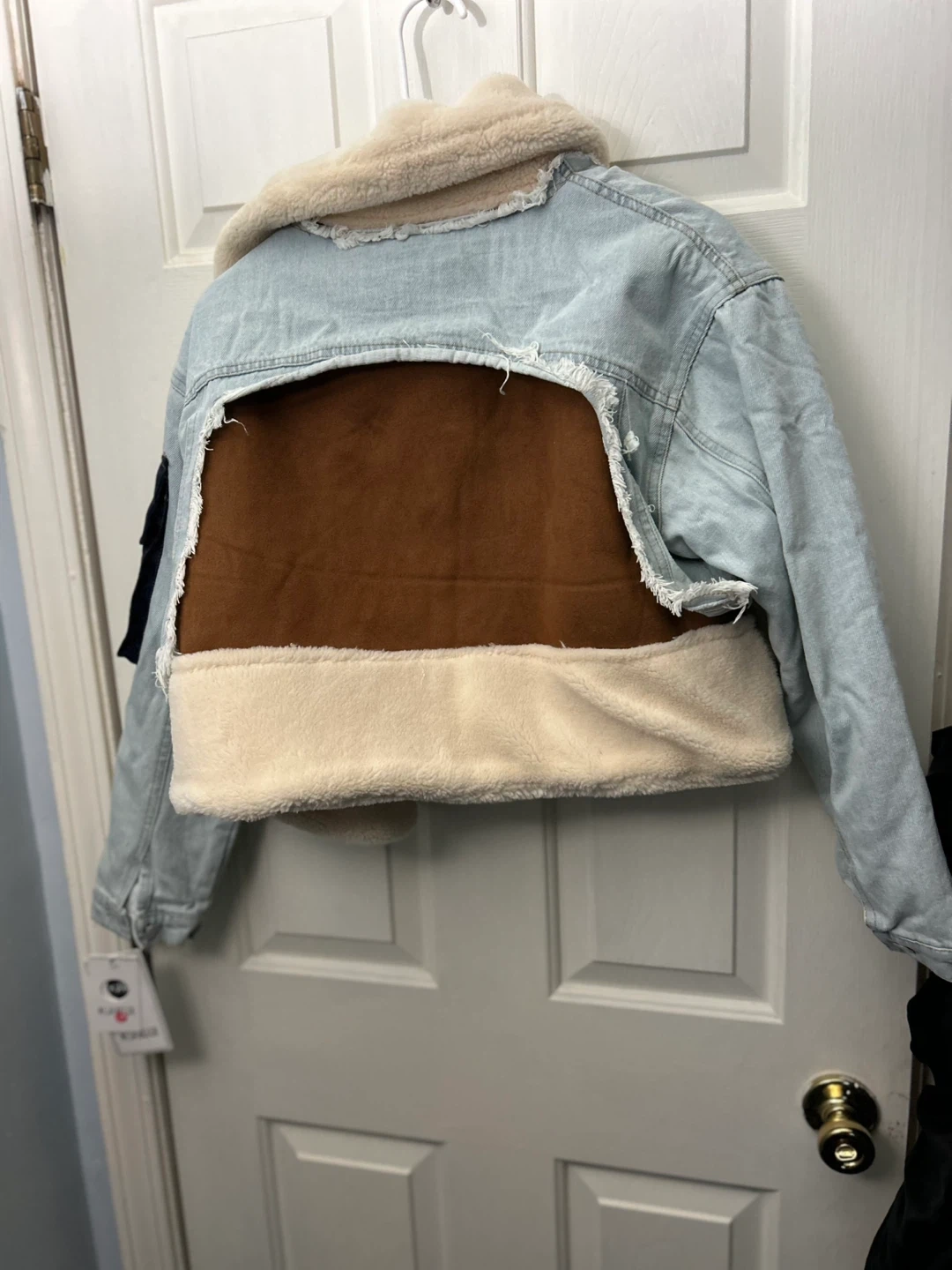 This distressed denim jacket features a cozy sherpa lining and stylish suede paneling. It's designed with a unique cut-out back and contrasting navy pockets. The jacket offers a warm and fashionable look for cooler weather.