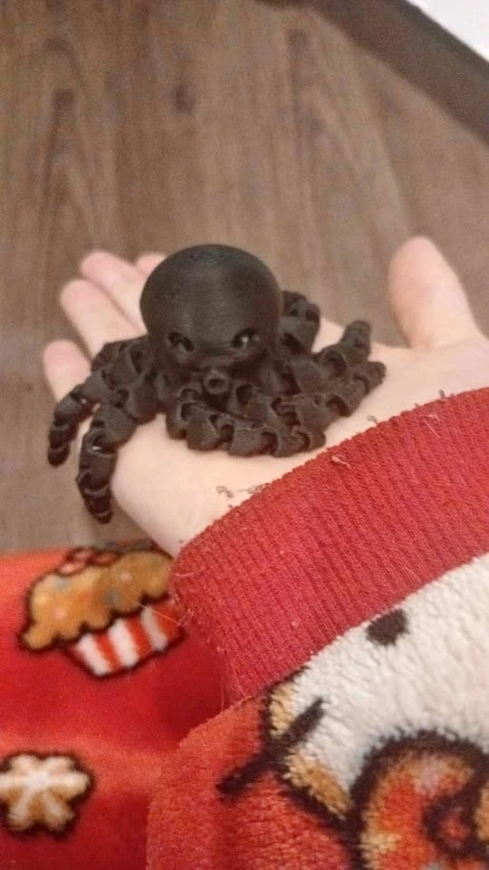 This is a black 3D printed octopus model with articulated and flexible tentacles. The compact size allows it to fit comfortably in one's hand, making it suitable for use as a fidget toy or desk decoration. Payment is required in cash, and the item is available for pickup only.