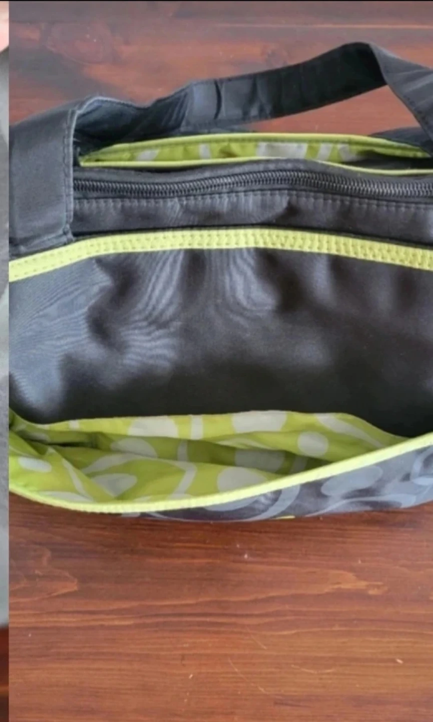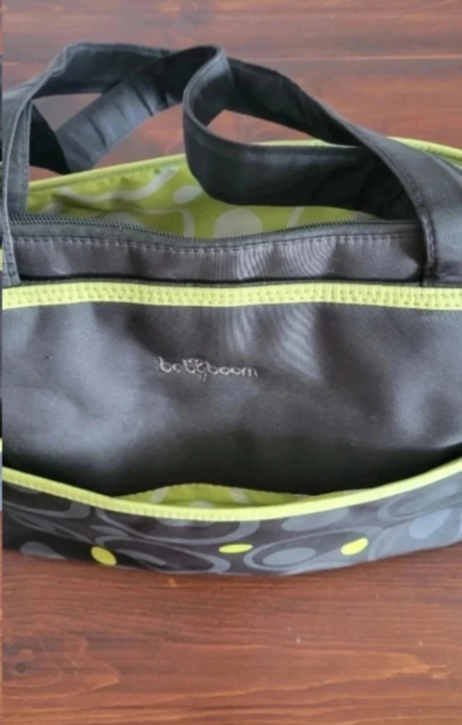 Giving away this Baby Boom diaper bag tote is grey with a fun circle and dot pattern in lime green. It features multiple pockets for organization. It's great for carrying all your baby's essentials when you're on the go!
