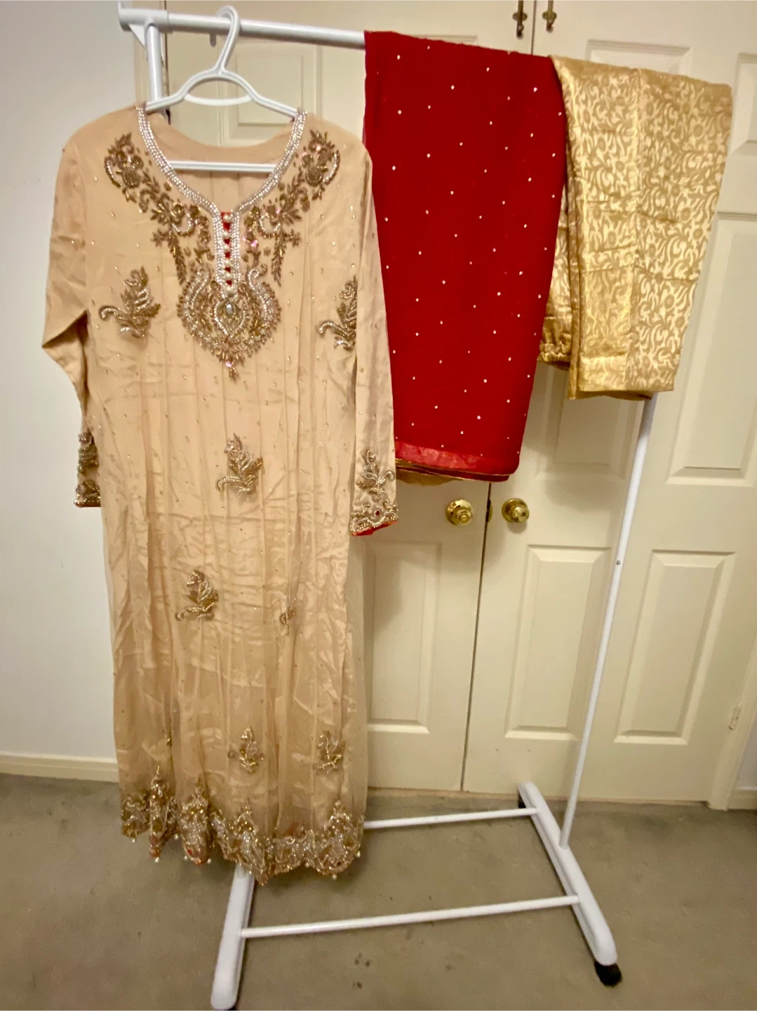 This is an embellished tan long Anarkali style shirt with intricate gold and pearl work. It's paired with a red dupatta scattered with small gold embellishments and matching gold self print pants. Perfect for special occasions!