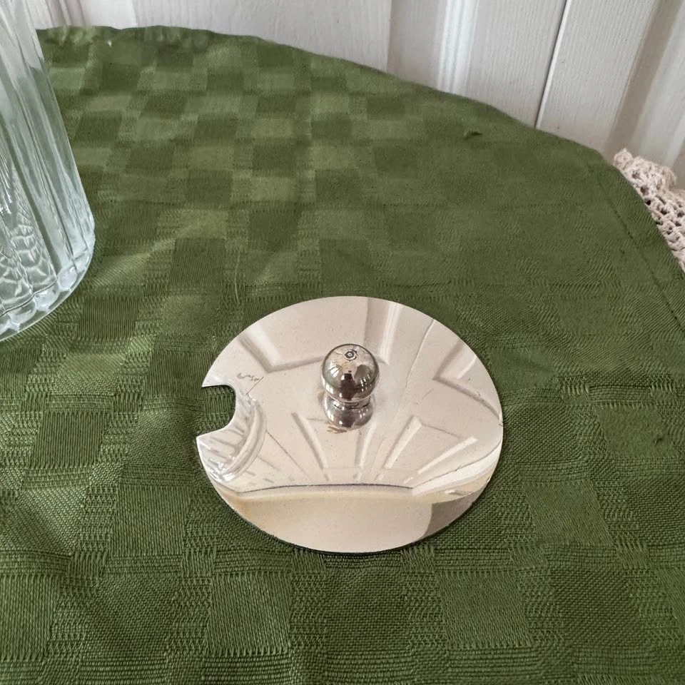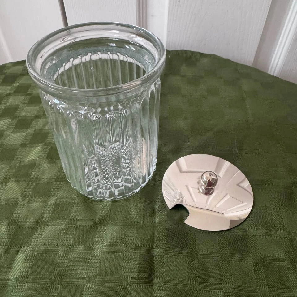 Buy & SellDepression glass jar with chrome lidDepression glass jar with chrome lid$12Depression era glass jar with chrome lid, with slit for spoon. Maybe a pickle or olive jar. Jar measures 8 cm wide and 11cm tall. Pick up north side.WHERE TO MEETOzernaView MapSELLERverifiedJoOzerna600 reviews0 chats·1 favorites·9 viewsSEND CHAT TO SELLERHi Jo! I’m interested in your listing.Hi Jo! I’m interested in your listing.Get the Karrot app to chatSign In to chat