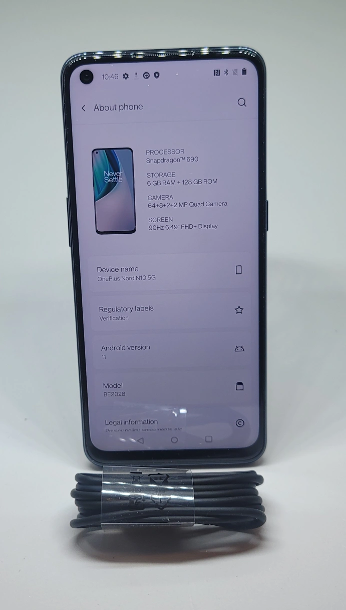 Selling a OnePlus Nord N10 5G in great condition! This phone comes with 6GB of RAM and 128GB of storage, perfect for everyday use. It also features a 64+8+2+2 MP Quad Camera and a 90Hz 6.49" FHD+ display. Included is a charging cable. The model number is BE2028.