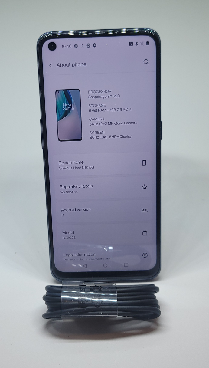 Selling a OnePlus Nord N10 5G in great condition! This phone comes with 6GB of RAM and 128GB of storage, perfect for everyday use. It also features a 64+8+2+2 MP Quad Camera and a 90Hz 6.49" FHD+ display. Included is a charging cable. The model number is BE2028.