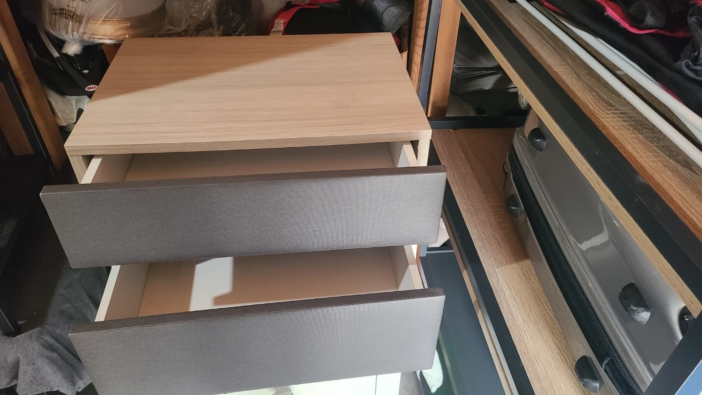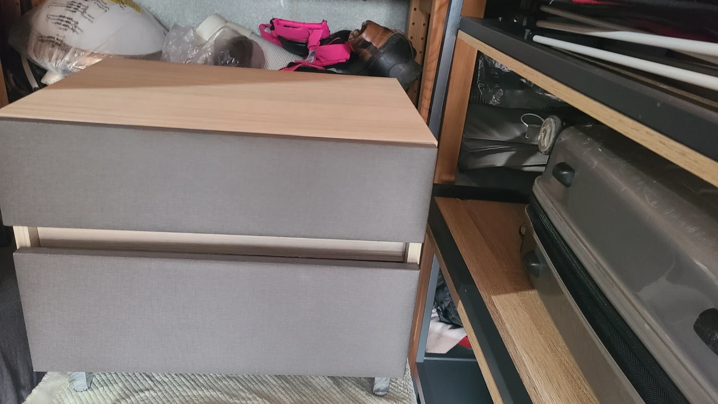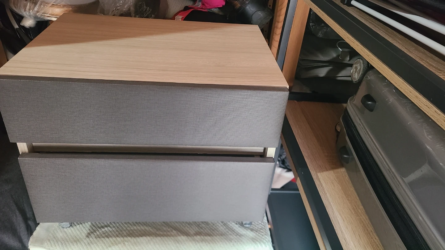 Selling a bedside table with two drawers. It's in good condition and perfect for adding some storage next to your bed or in a small space. The drawers slide smoothly. It's a neutral gray color that would fit into many decor styles