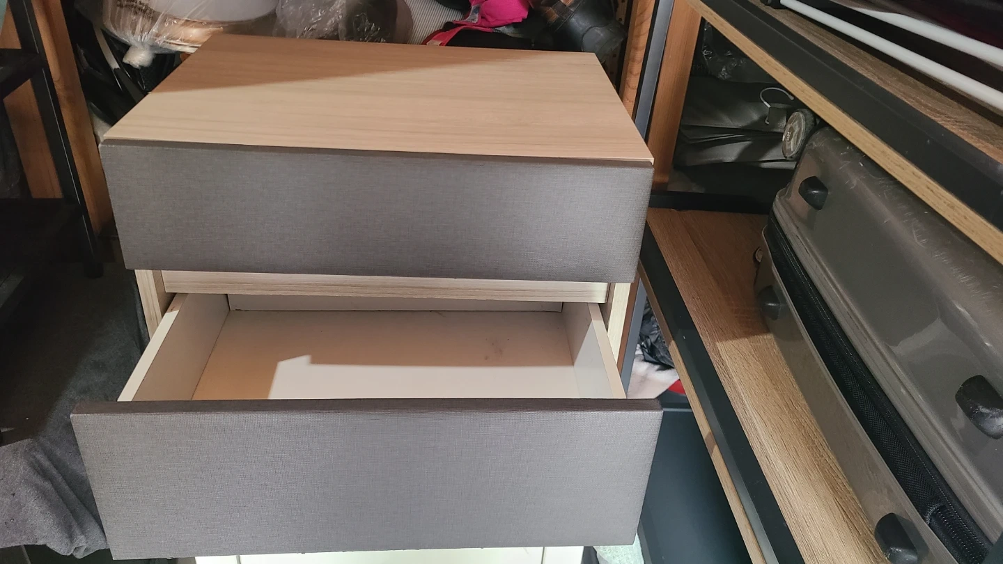 Selling a bedside table with two drawers. It's in good condition and perfect for adding some storage next to your bed or in a small space. The drawers slide smoothly. It's a neutral gray color that would fit into many decor styles