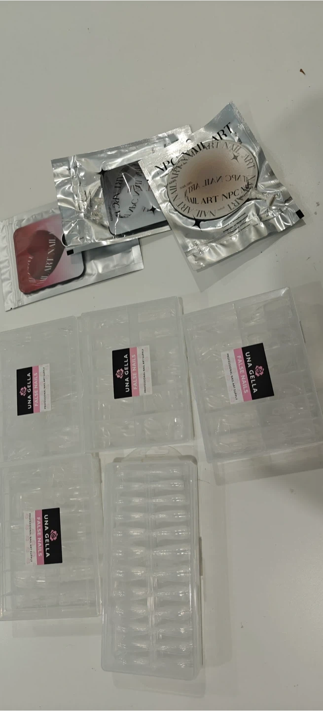 This kit includes numerous nail art supplies, such as false nails in various sizes from UNA GELLA, nail glue, files, and decorative tapes. It also contains adhesive tabs and various other manicure accessories. This collection offers a wide range of tools for detailed nail art creations.