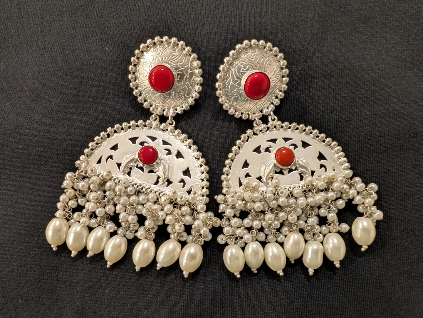 These are silver-toned dangle earrings. They're accented with vibrant red stones and multiple strands of faux pearls. Perfect for adding a touch of elegance to any outfit!