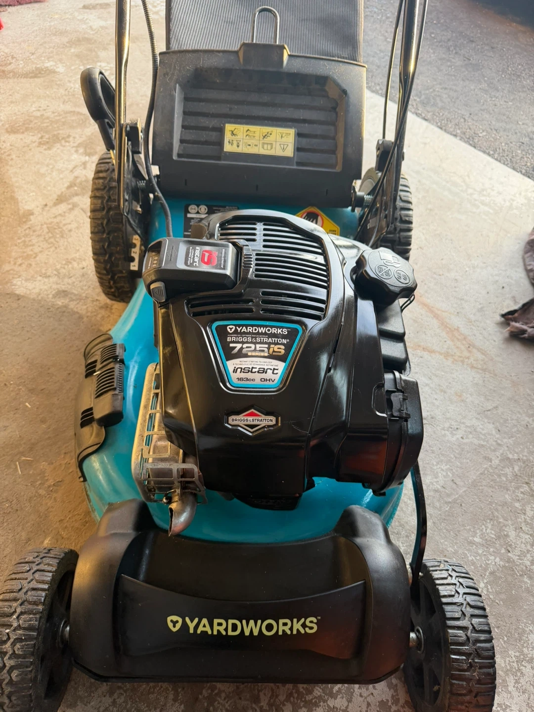 YARDWORKS 72V lawn mower with a Briggs & Stratton 163cc OHV engine. Self-propelled model with mulching capability. Has a 21-inch cutting deck. Easy to start and manoeuvre. Keeps your lawn looking sharp!