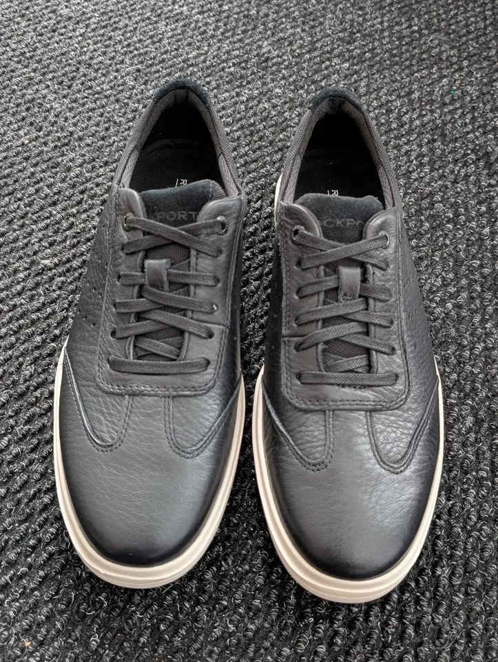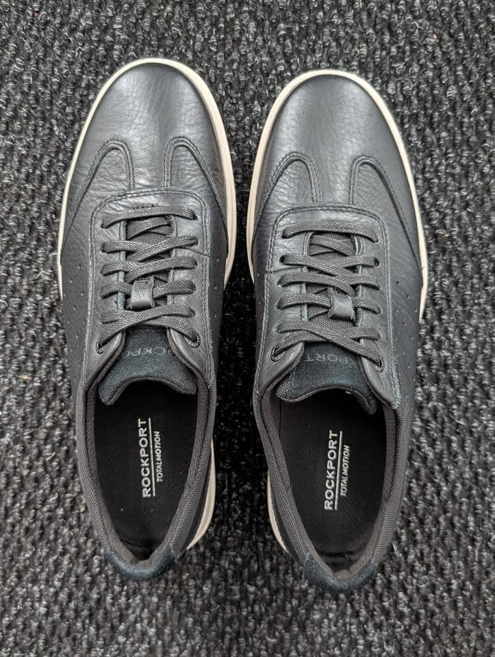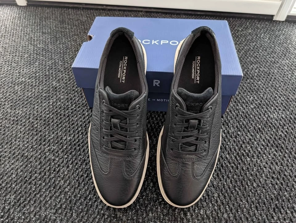 Selling brand new Rockport Total Motion Court T-Toe sneakers in black leather. Never worn, only taken out for photos. Size men's 7.5 M.