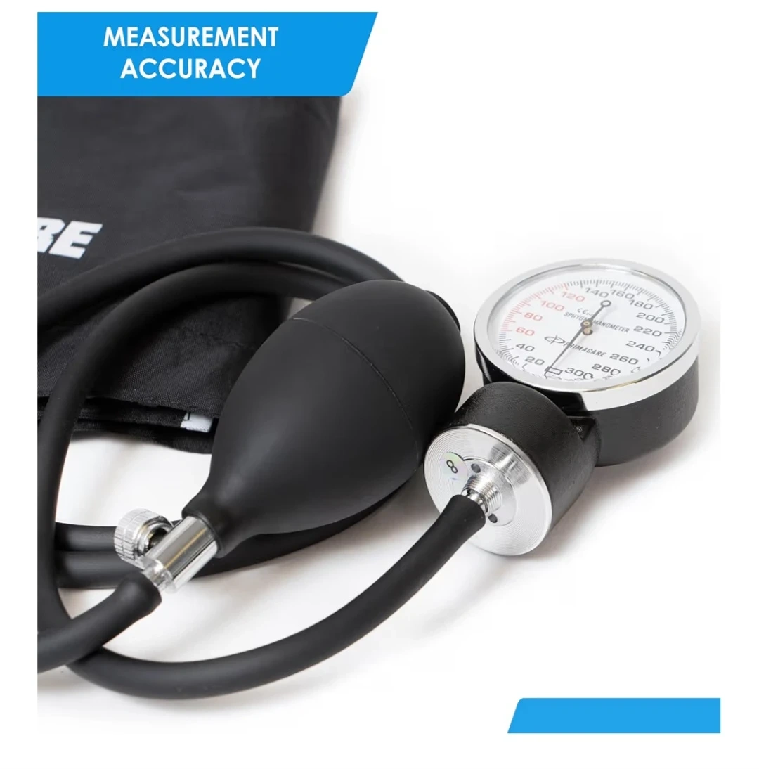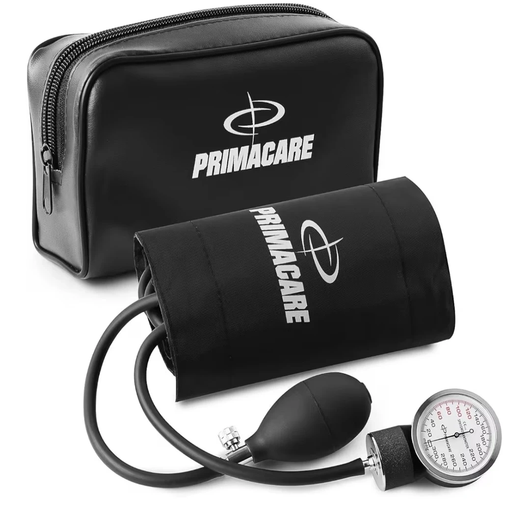 Primacare aneroid sphygmomanometer for measuring blood pressure. Includes a black cuff, bulb, and gauge. Comes with a carrying case. Measurement accuracy is a key detail.