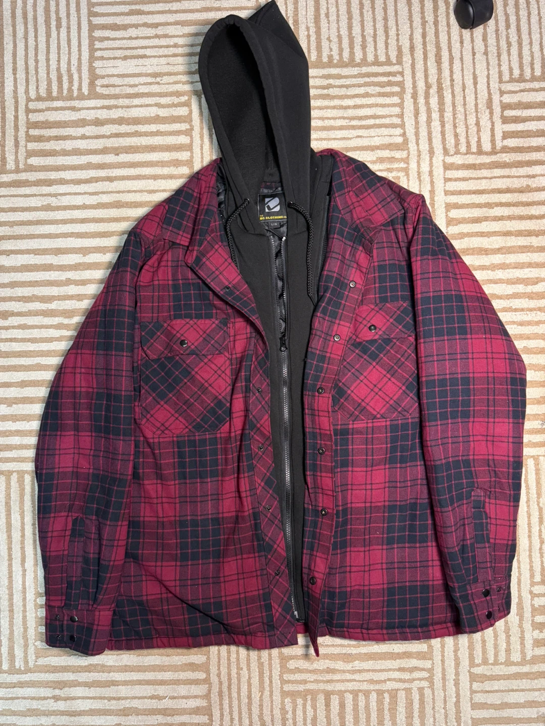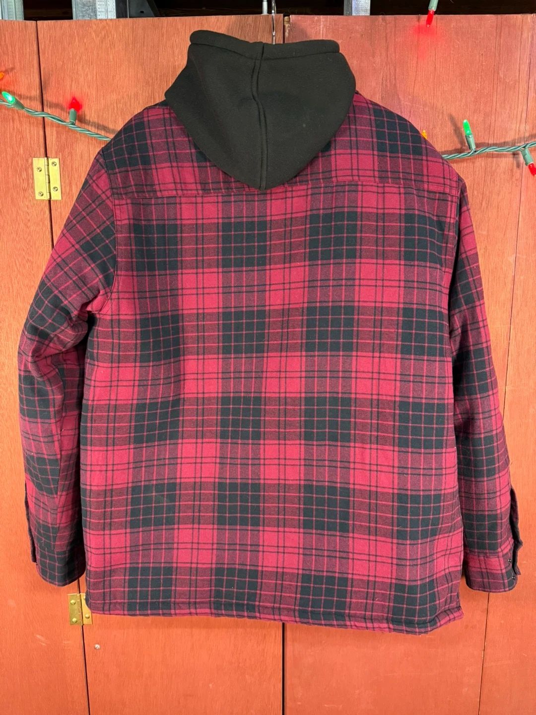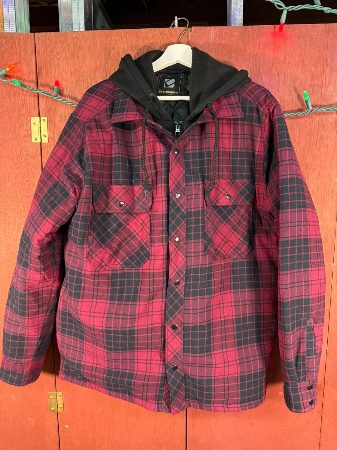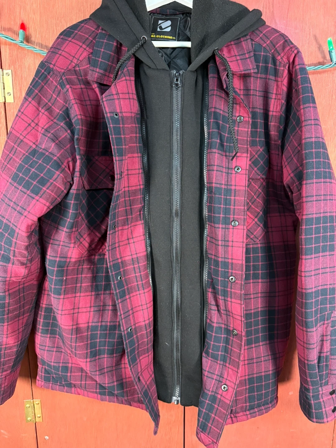 This is a BC Clothing Co. men’s quilted flannel overshirt with hood jacket, size large, in a red and black plaid pattern, perfect for adding an extra layer of warmth on chilly days.
