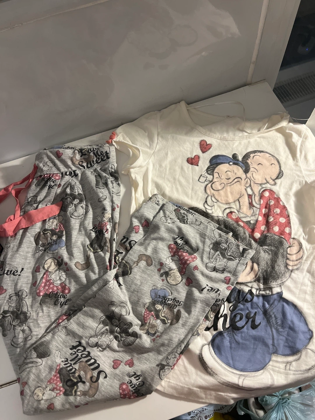 This Osho pajama set features a graphic tee with Popeye and Olive Oyl and matching grey patterned pants.