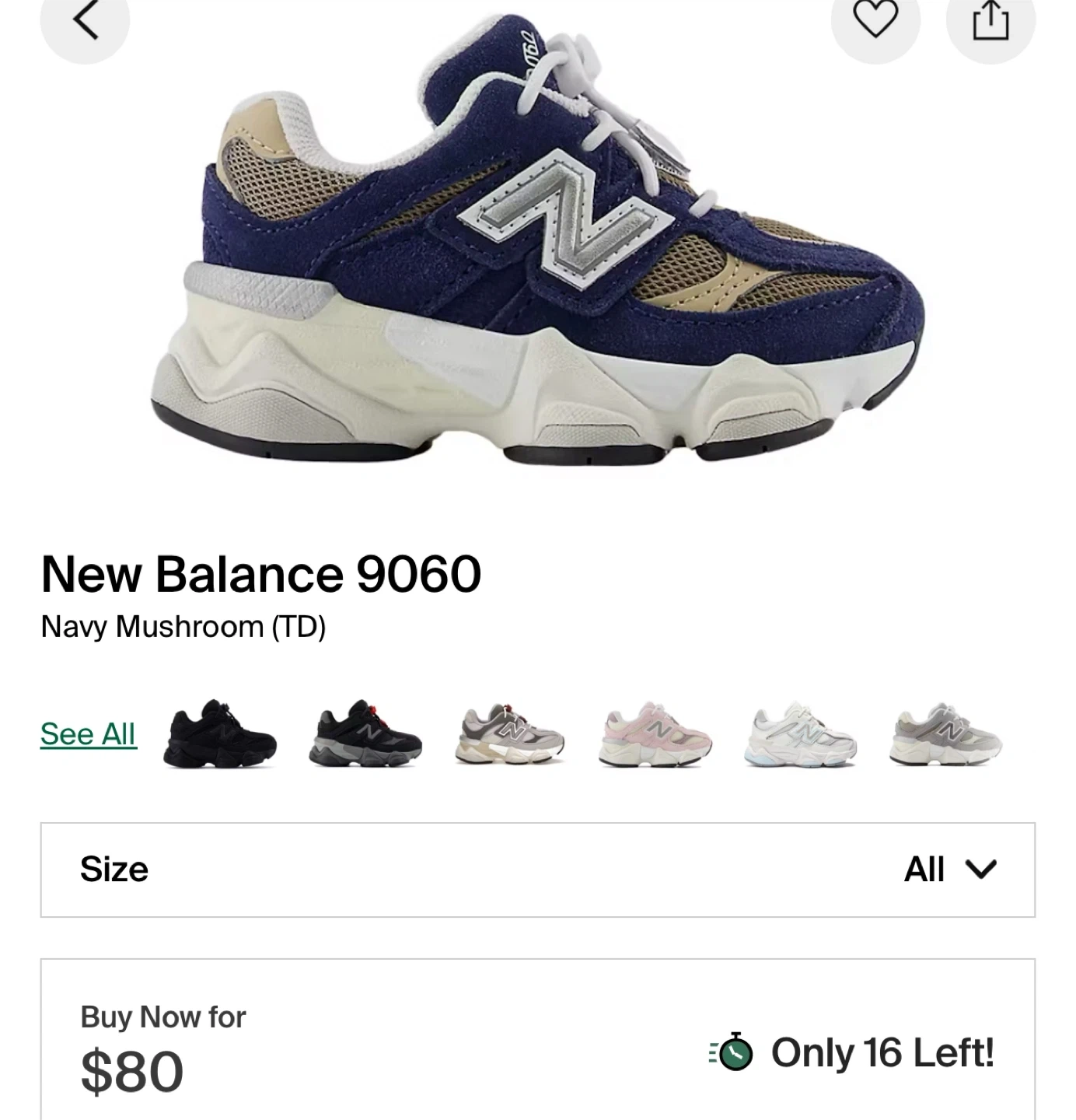 New Balance 9060 sneakers in Navy Mushroom. These kids' shoes feature a suede and mesh upper. It's a classic athletic shoe design for little ones.