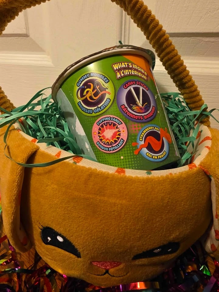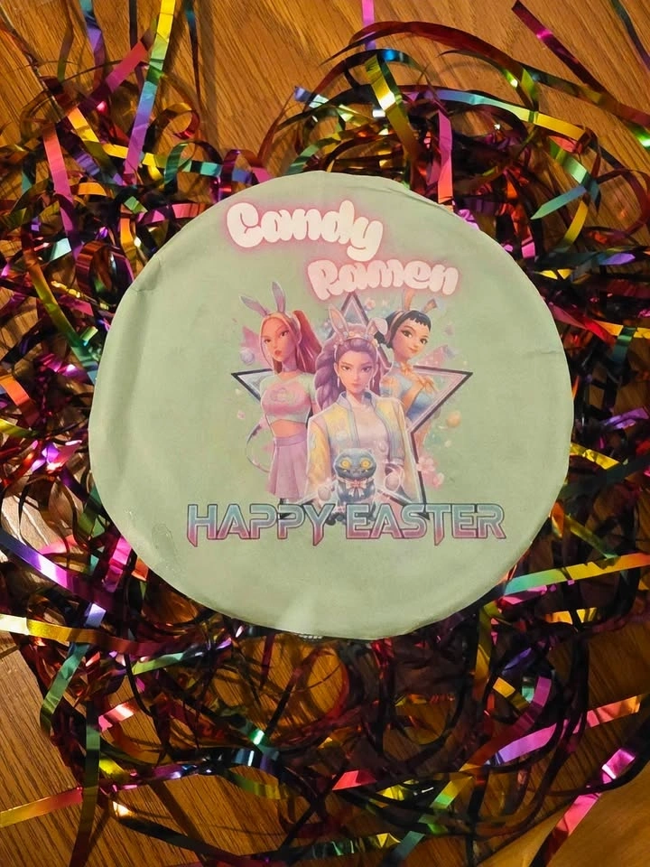 Each Candy Ramen Cup comes with candy chopsticks, gummy noodles, popping candy, and strawberry candy gel. Each cup includes a K-pop Happy Easter label! Perfect for kids who love K-pop Demon Hunters or Huntrix. Great to add to an Easter basket!
