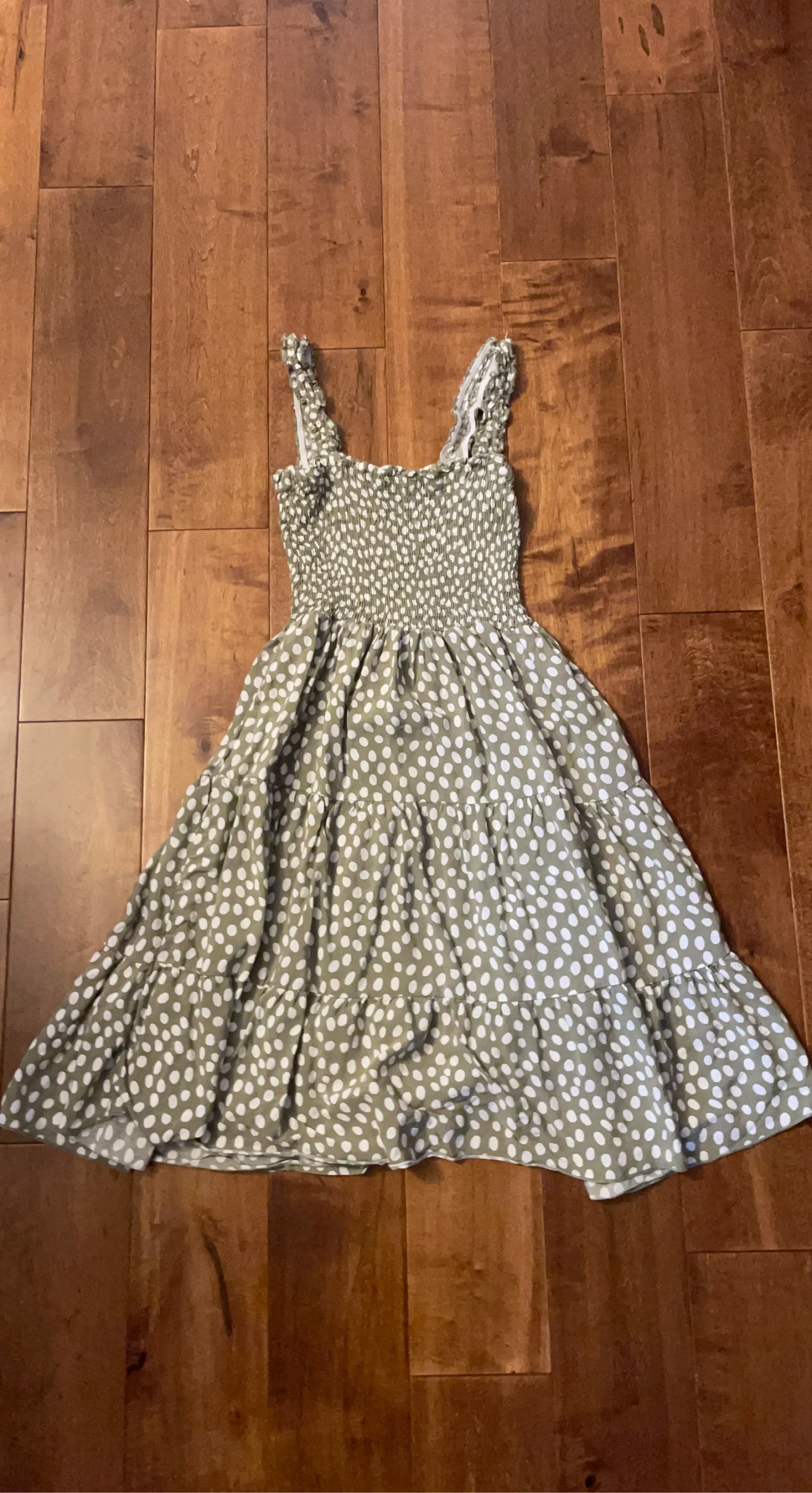 This is a cute green dress with white polka dots. It's a tiered, knee-length style with smocked detailing on the bodice and ruffled straps. Lightweight fabric for warm weather!