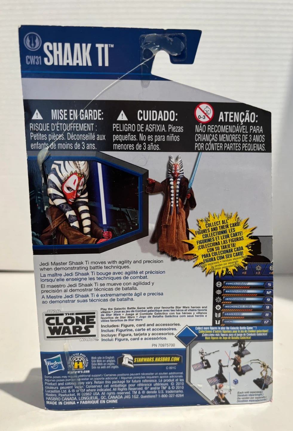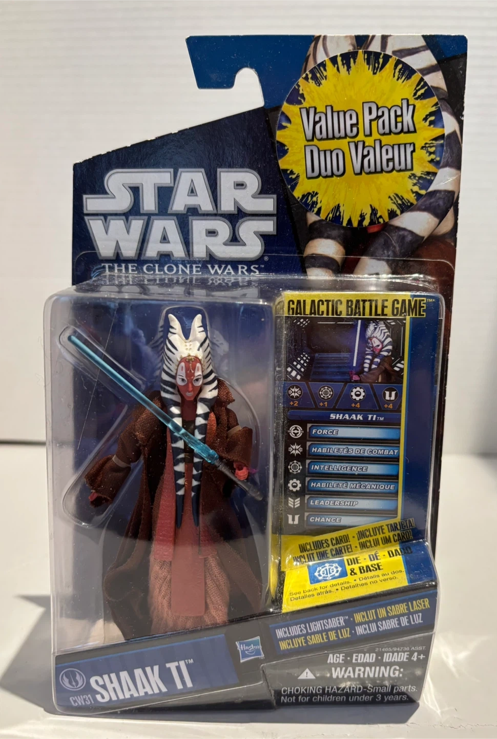 This Star Wars action figure features Shaak Ti from The Clone Wars series. It includes the figure, lightsaber, and a collectible card for the Galactic Battle Game. Recommended for ages 4 and up.