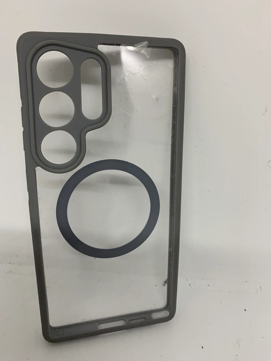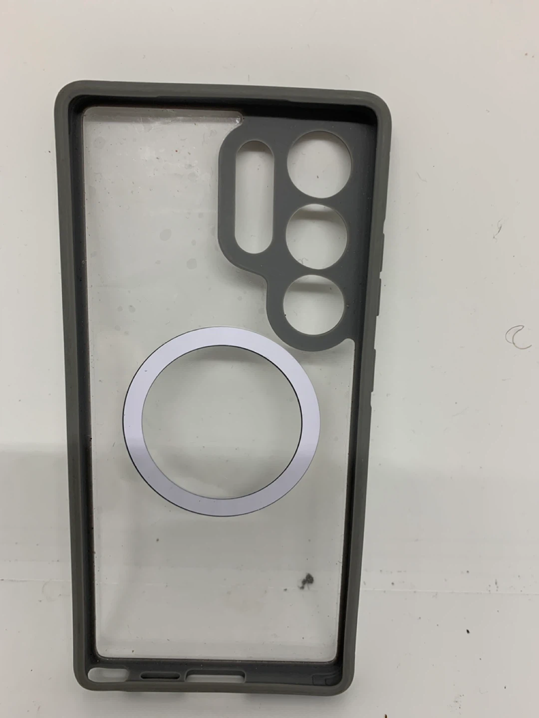 Selling a phone case for the Samsung Galaxy S23 Ultra. It's a clear case with a gray bumper and a MagSafe-compatible ring on the back. It's in great condition and ready to protect your phone