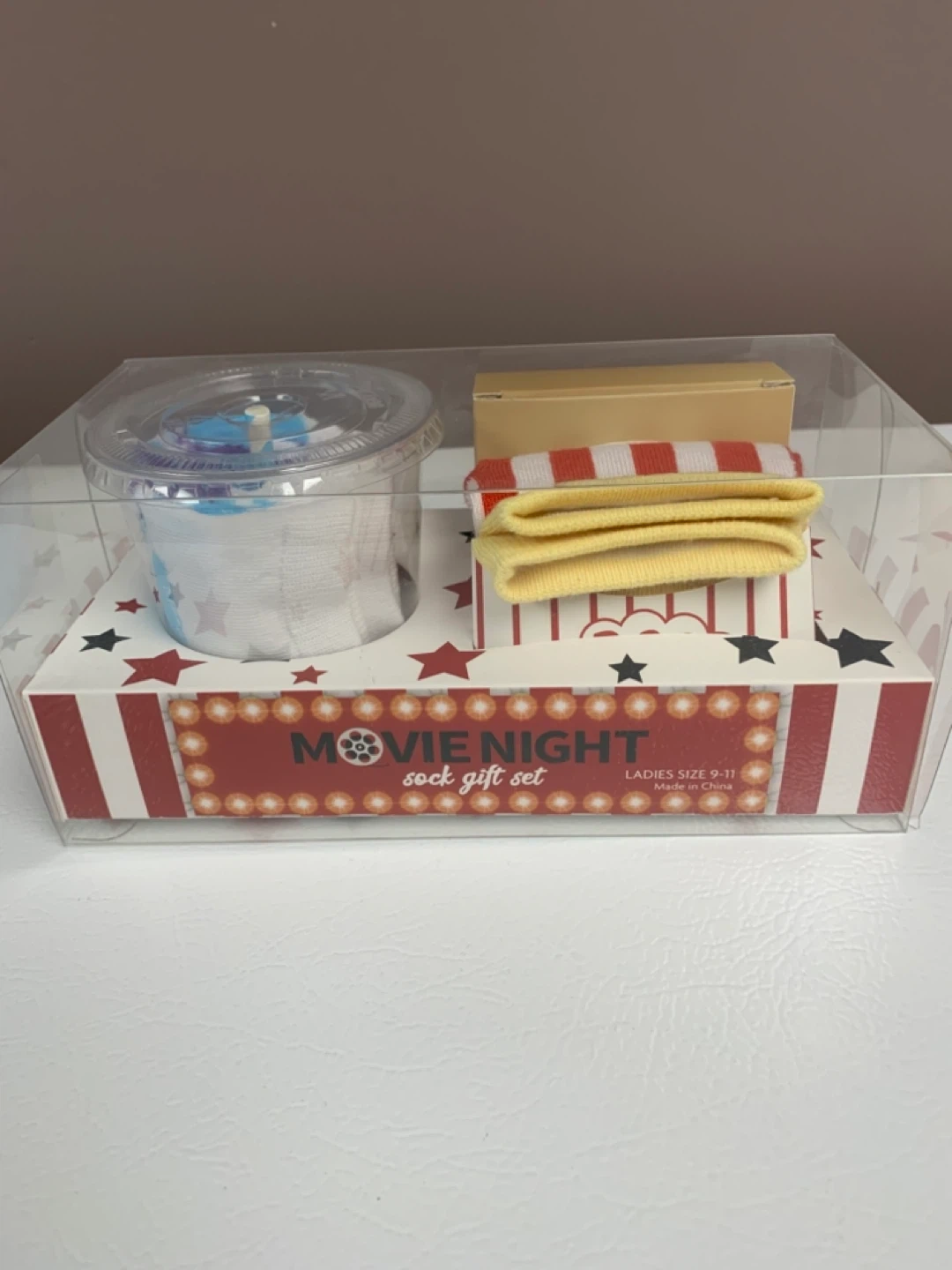 New"Movie Night" sock gift set includes three pairs of crew socks. Perfect Gift for someone who loves funky socks.