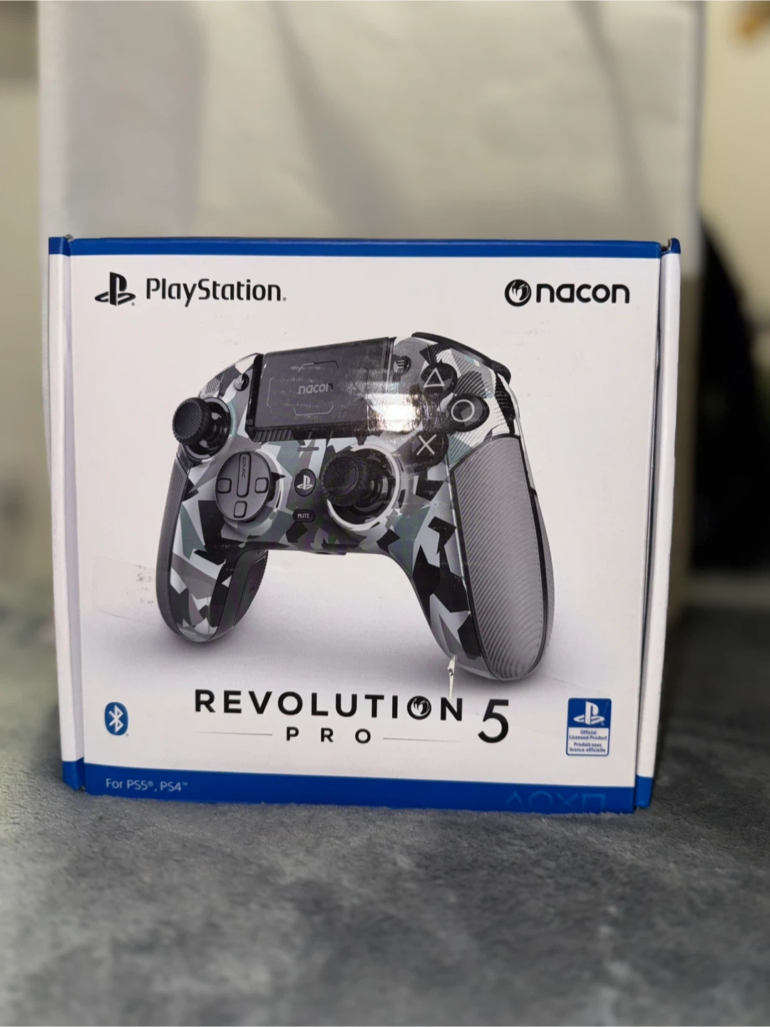 This Nacon Revolution 5 Pro controller is designed for PlayStation 5 and PlayStation 4. It connects via Bluetooth. The controller features a camouflage design.