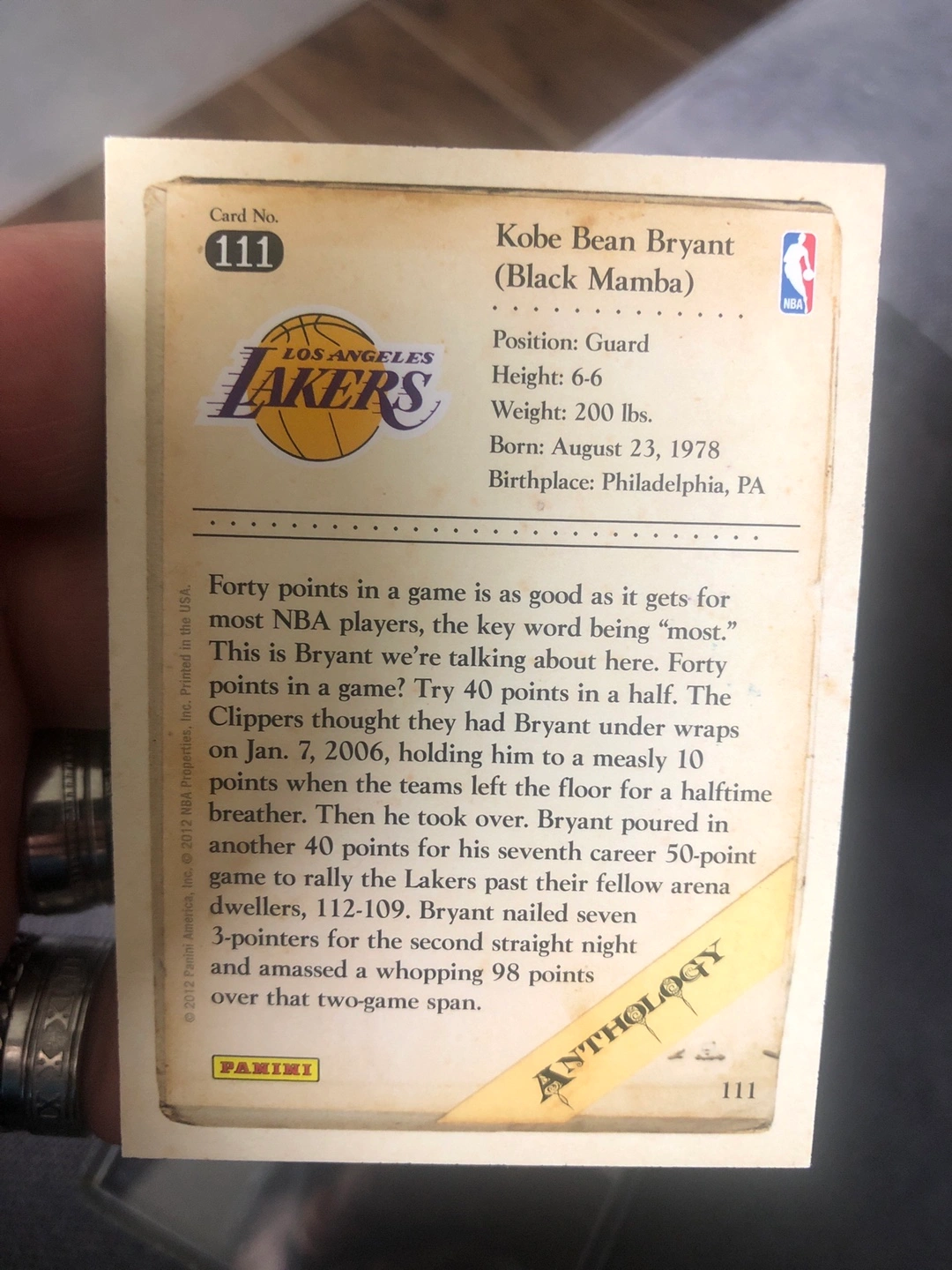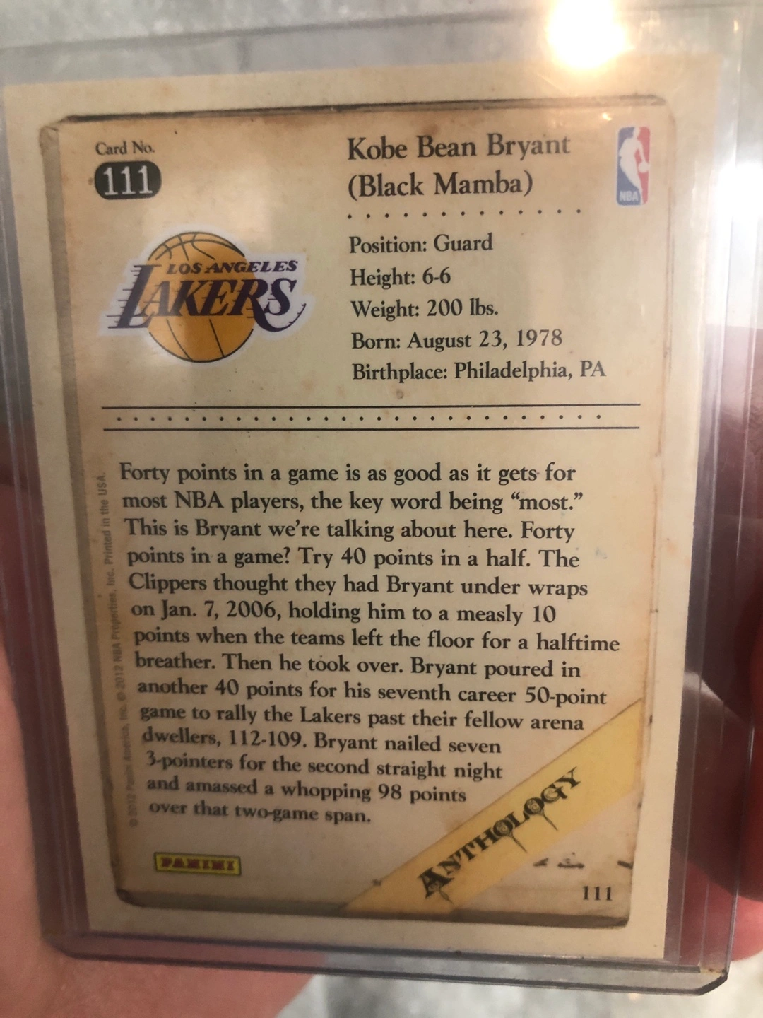 Selling a Kobe Bryant Los Angeles Lakers Panini trading card. The back of the card provides details such as his position as a guard, height of 6-6, and weight of 200 lbs. It also mentions his birthdate as August 23, 1978, and birthplace as Philadelphia, PA