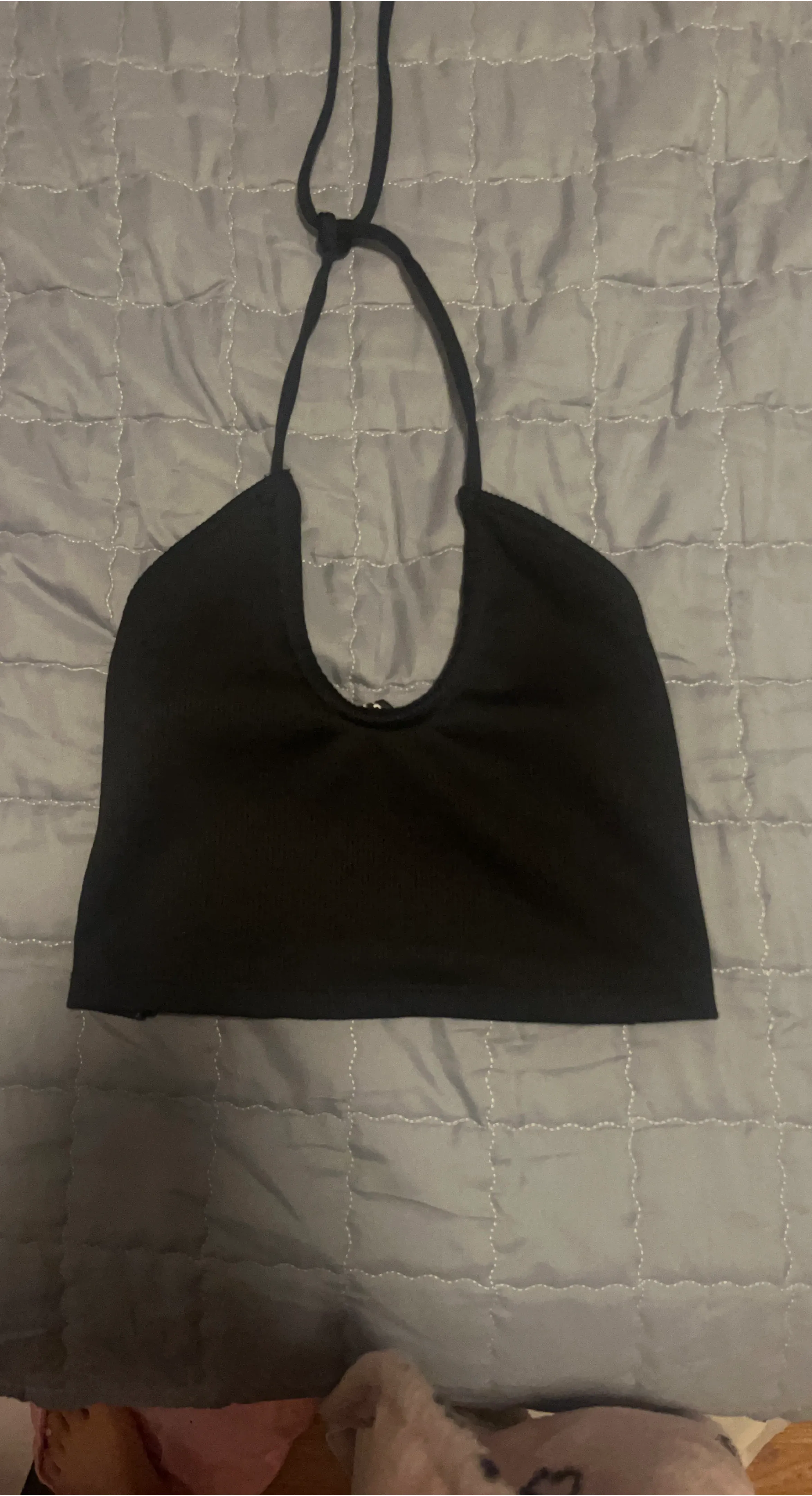 This is a black halter neck crop top. It's made of a stretchy knit material. It features a wide scoop neckline and adjustable neck ties.