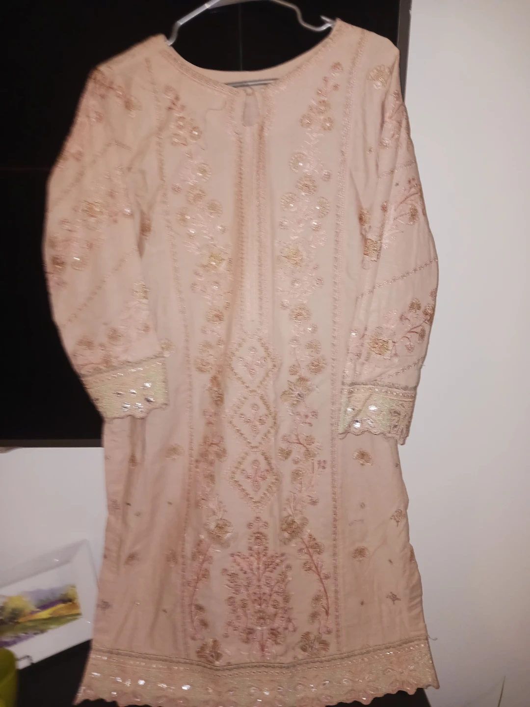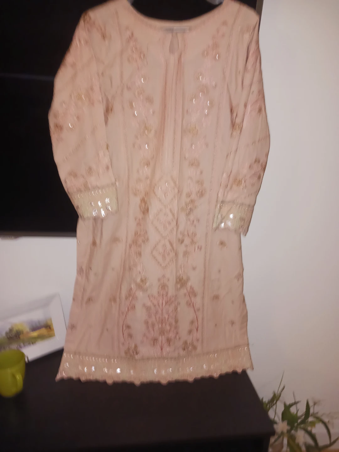 Pretty pink kurti with intricate embroidery and sequin accents. Comes with matching comfortable pants. Perfect for casual wear or dressing up!