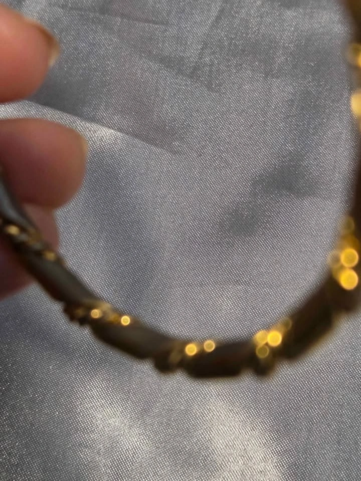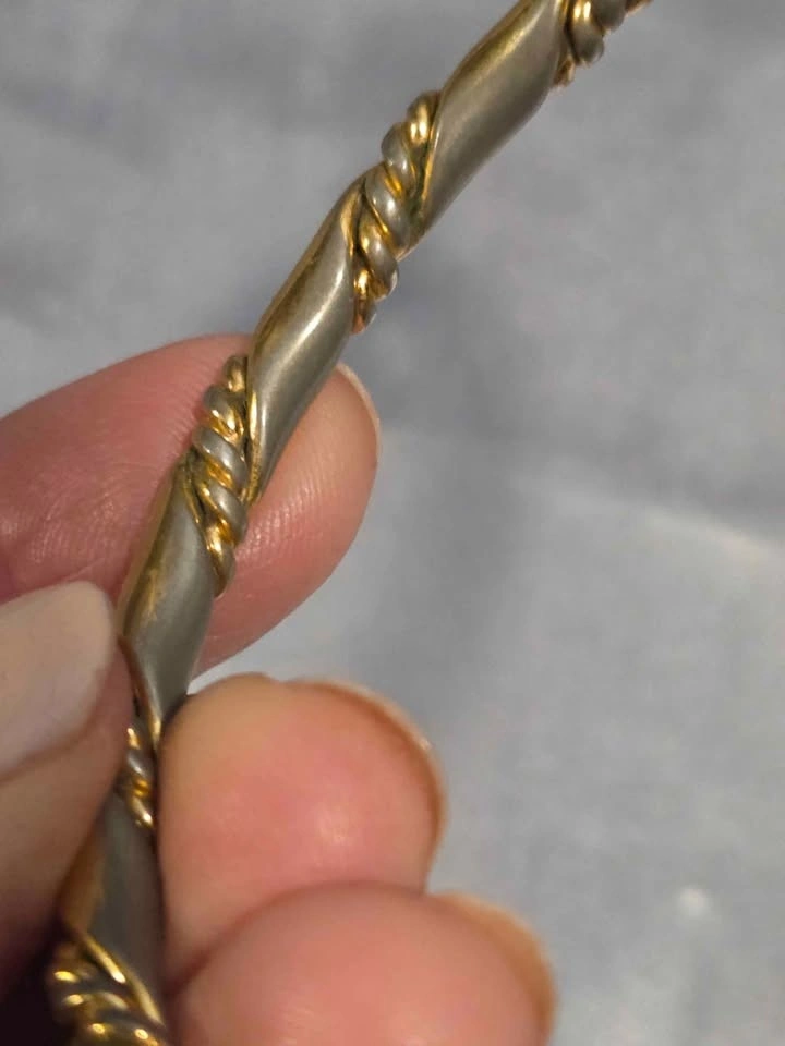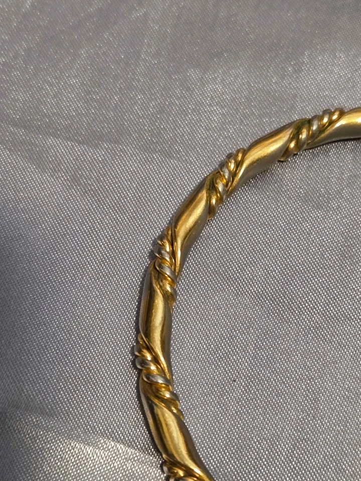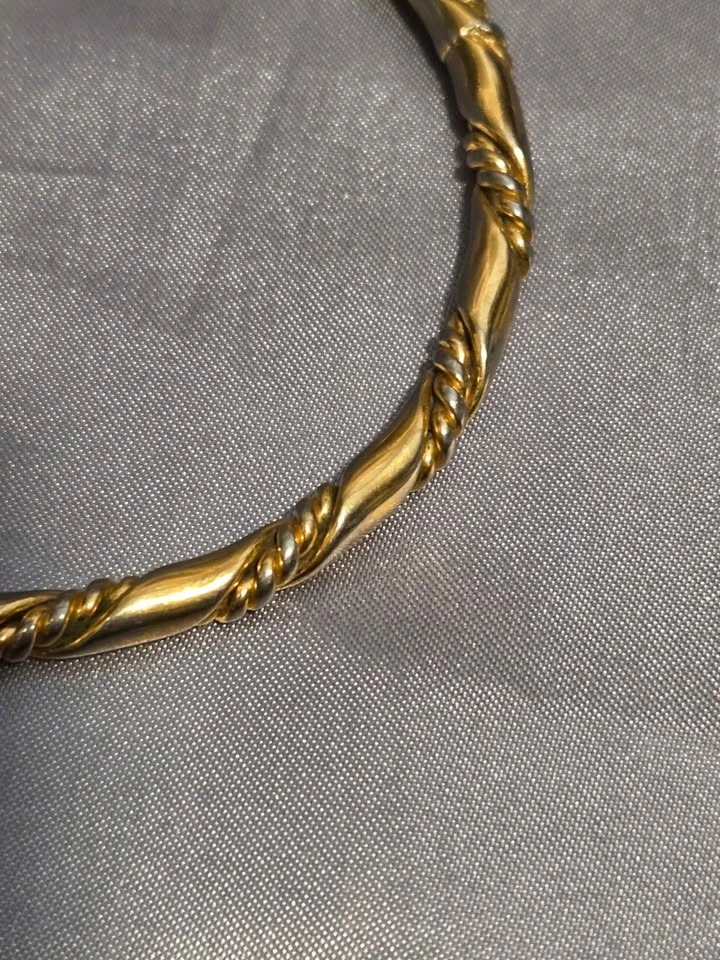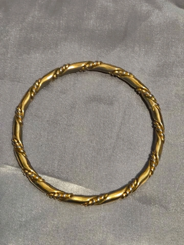 Classic vintage gold-tone bangle bracelet with an elegant twisted rope design. Timeless, versatile, and perfect worn alone or stacked. Gold-tone finish, twisted rope/cable design, slip-on bangle style, lightweight and comfortable. Very good pre-owned condition. Minor discoloration on the inside from normal wear; not visible when worn. Exterior remains polished. Pick up in Oshawa near Ritson and Hillcroft.