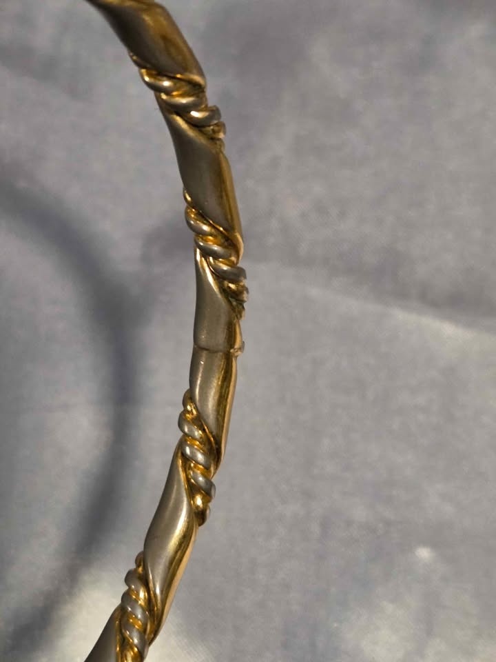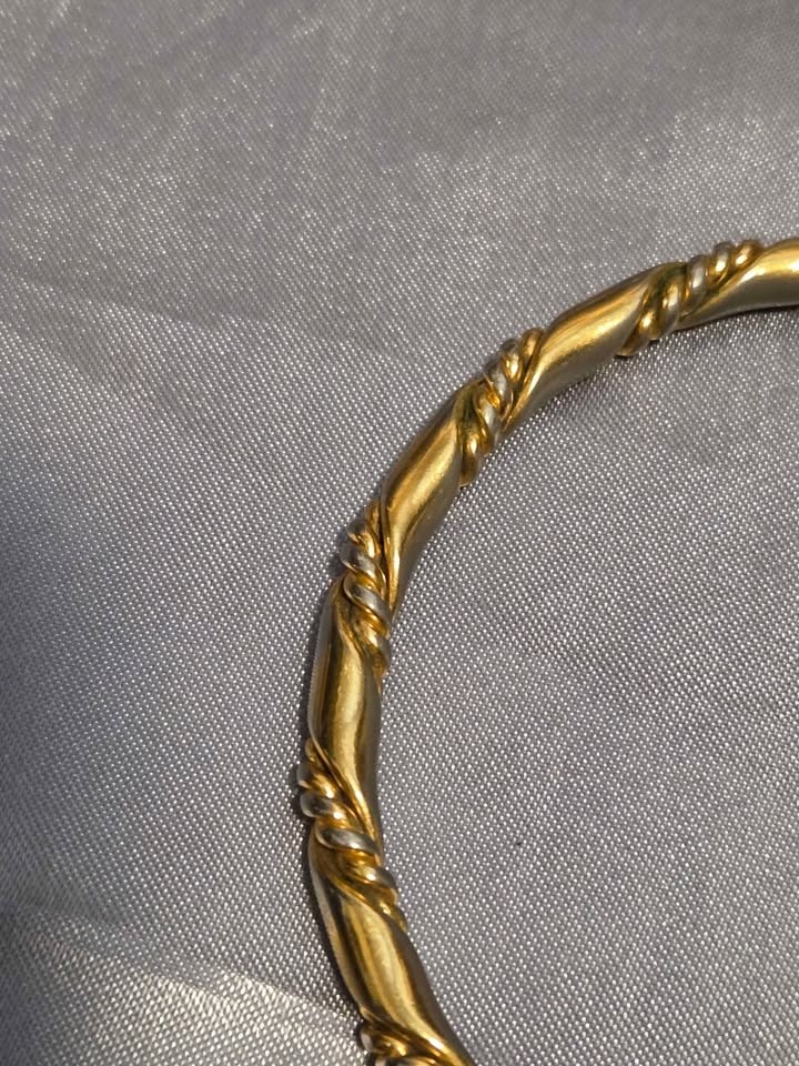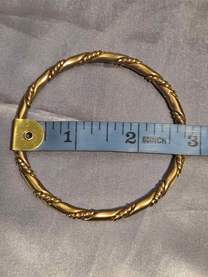 Classic vintage gold-tone bangle bracelet with an elegant twisted rope design. Timeless, versatile, and perfect worn alone or stacked. Gold-tone finish, twisted rope/cable design, slip-on bangle style, lightweight and comfortable. Very good pre-owned condition. Minor discoloration on the inside from normal wear; not visible when worn. Exterior remains polished. Pick up in Oshawa near Ritson and Hillcroft.