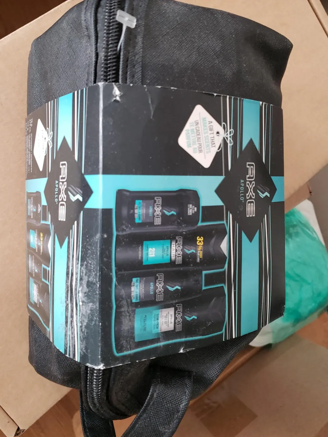 This Axe Apollo gift set includes a toiletry bag with shower gel, deodorant, and hair products. It's a great gift idea! The set contains multiple Axe Apollo scented items for all-day freshness.
