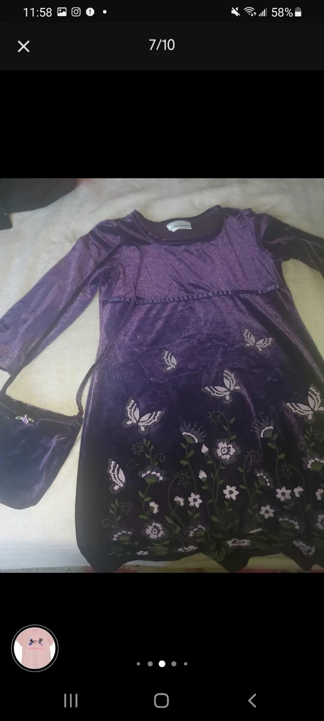 This adorable purple velvet dress features a beautiful butterfly and floral print. It comes with a matching purse, perfect for little ones! It has long sleeves and a sparkly shimmer throughout.