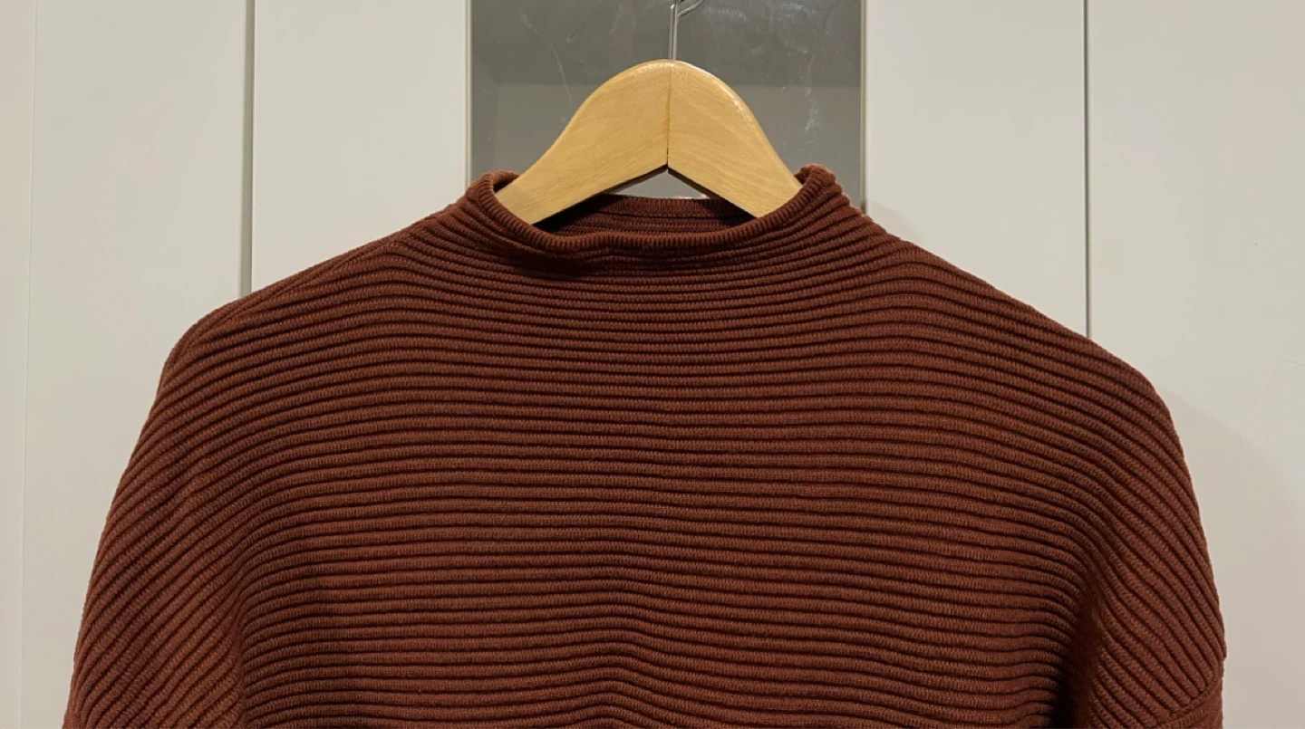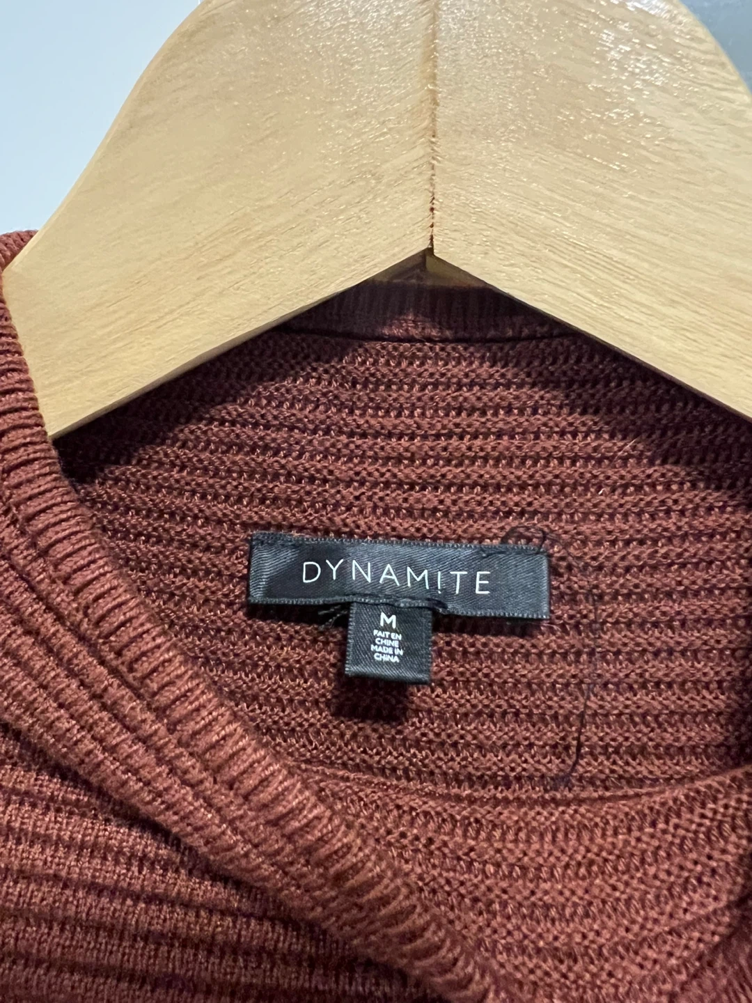 Ribbed knit sweater from Dynamite in maroon. Has a boxy fit bc of the drop shoulder and also has a mock neck type of neckline. Runs a bit small so would fit size small better in my opinion.